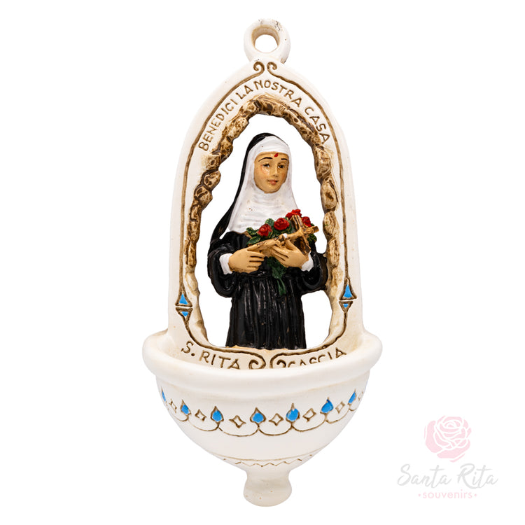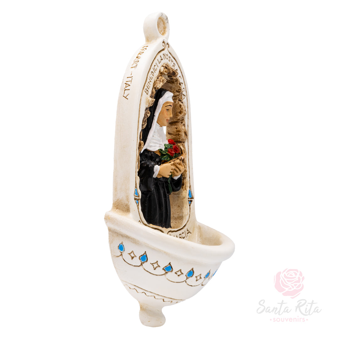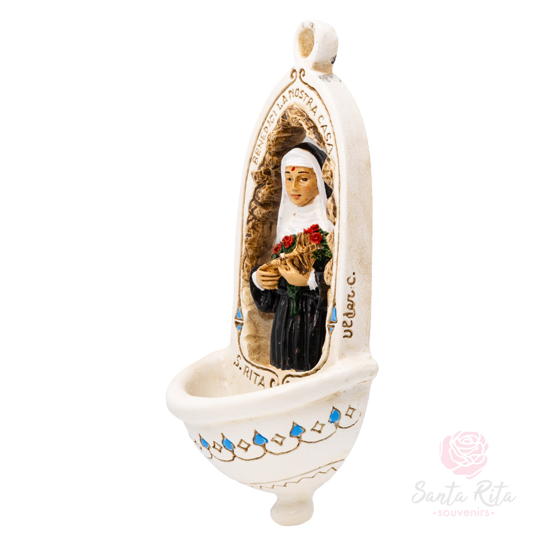 Acquasantiera Santa Rita Rose e Croce 13cm Maestro Cassetta Resina Marmo