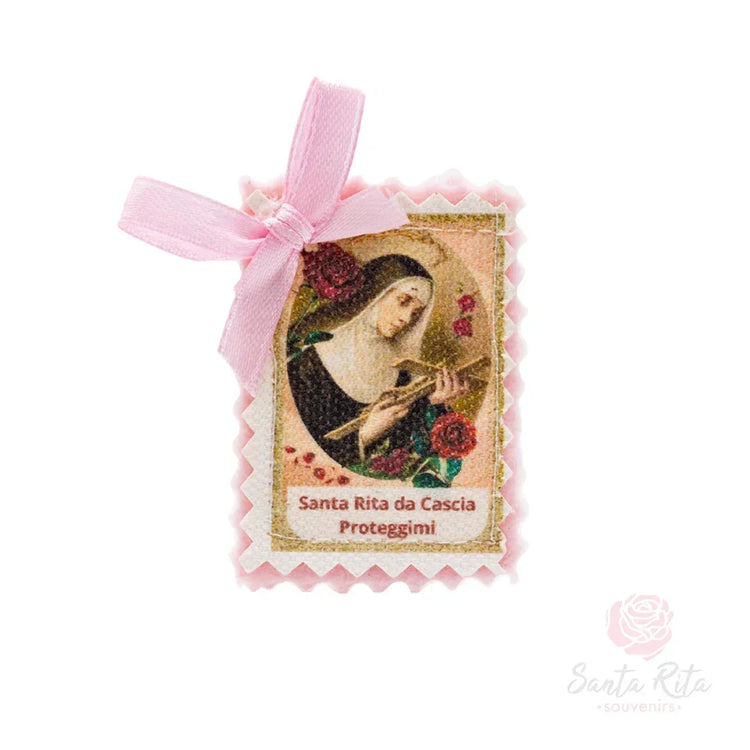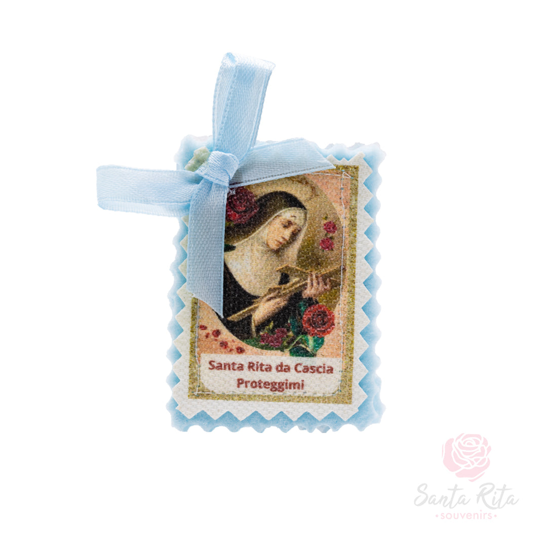 Questo tenero abitino devozionale raffigura Santa Rita da Cascia ed è pensato appositamente per i bambini. Realizzato in tessuto stampato, con rifiniture in raso e fiocchetto decorativo, è disponibile in due dolci varianti: rosa e celeste. La preghiera “Santa Rita da Cascia proteggimi” lo rende un simbolo semplice ma profondo di affidamento, perfetto da appuntare su vestitini da battesimo, corredini o da custodire nella cameretta come segno di benedizione e amore.