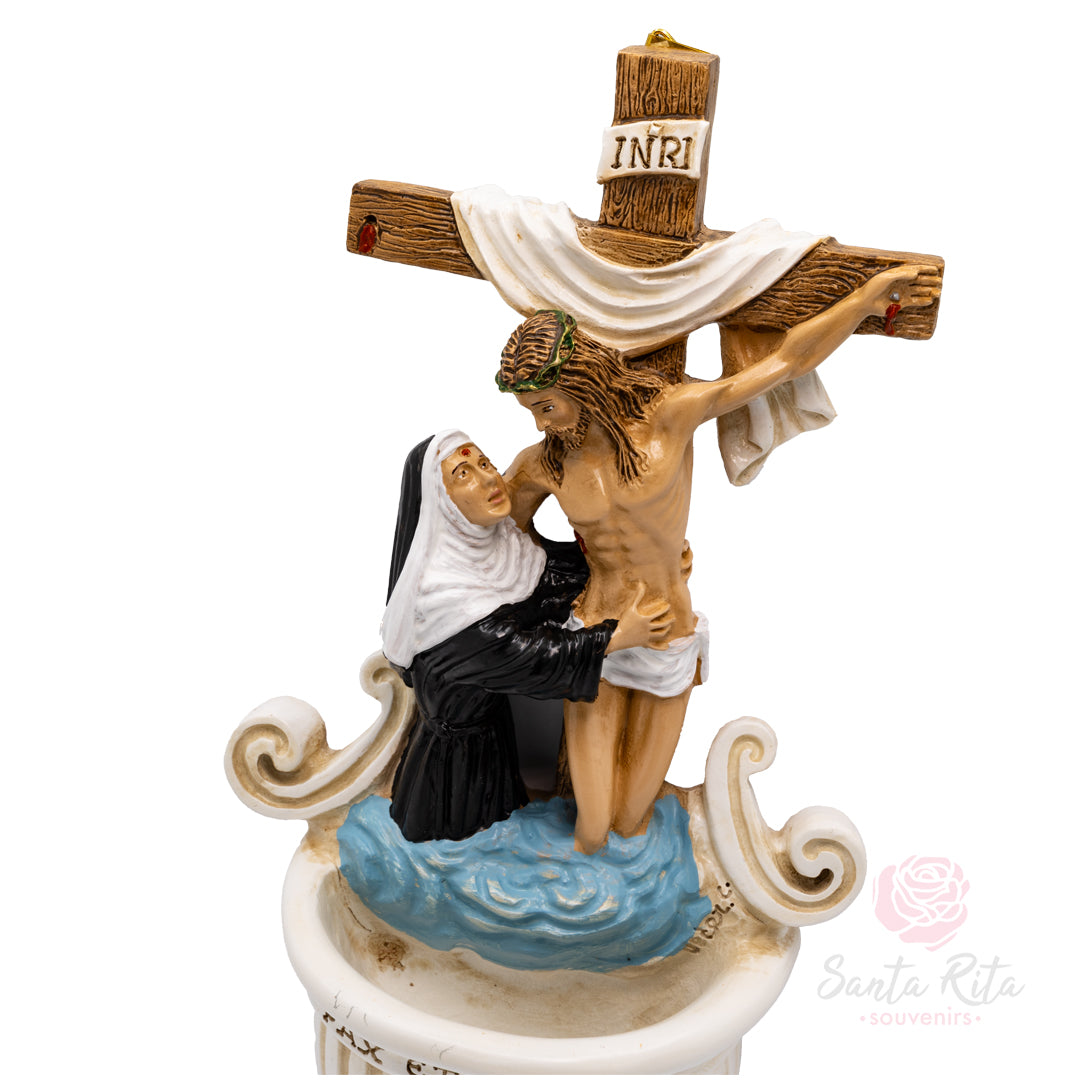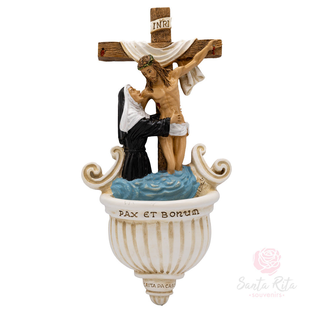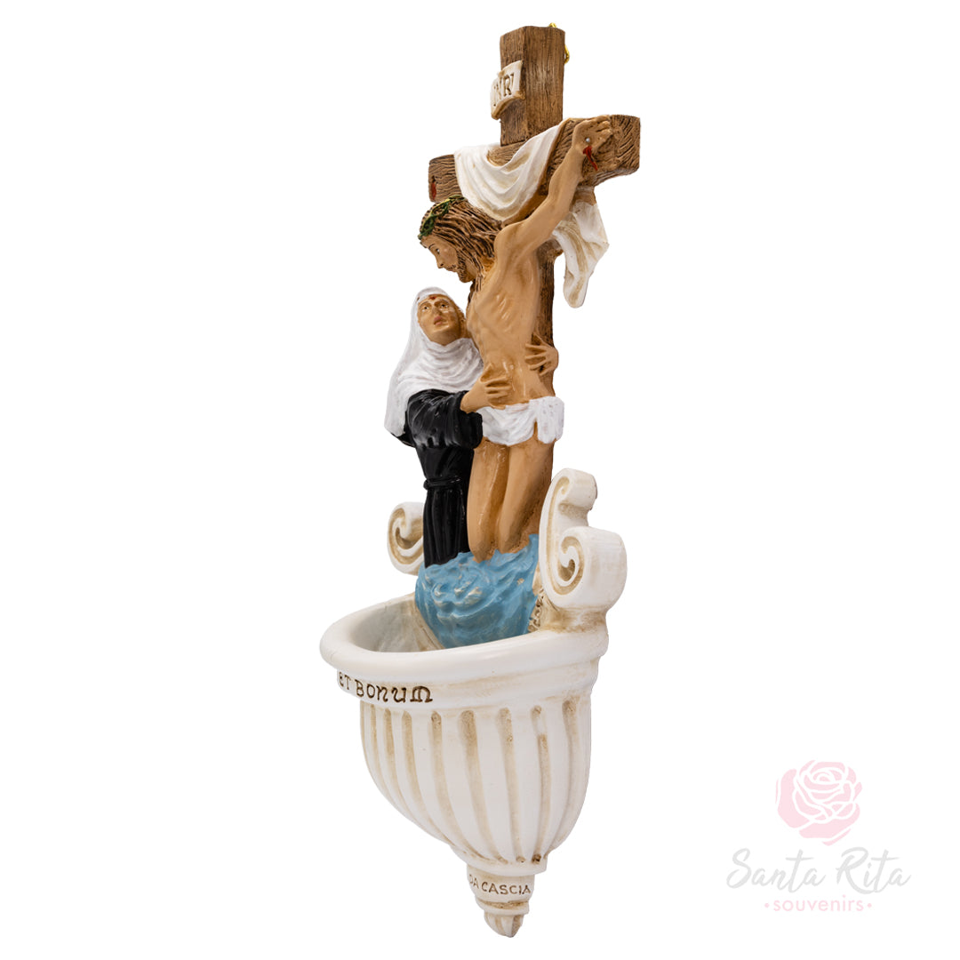 ✨ Acquasantiera scultura artigianale Gesù abbraccia Santa Rita dalla croce, un'opera d'arte sacra che unisce devozione e funzionalità, rappresentando l'abbraccio divino di Cristo che dalla croce accoglie Santa Rita.