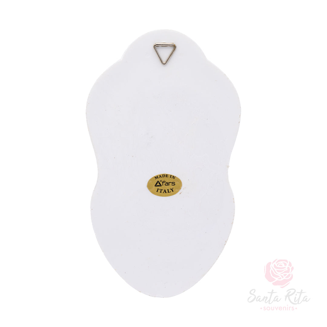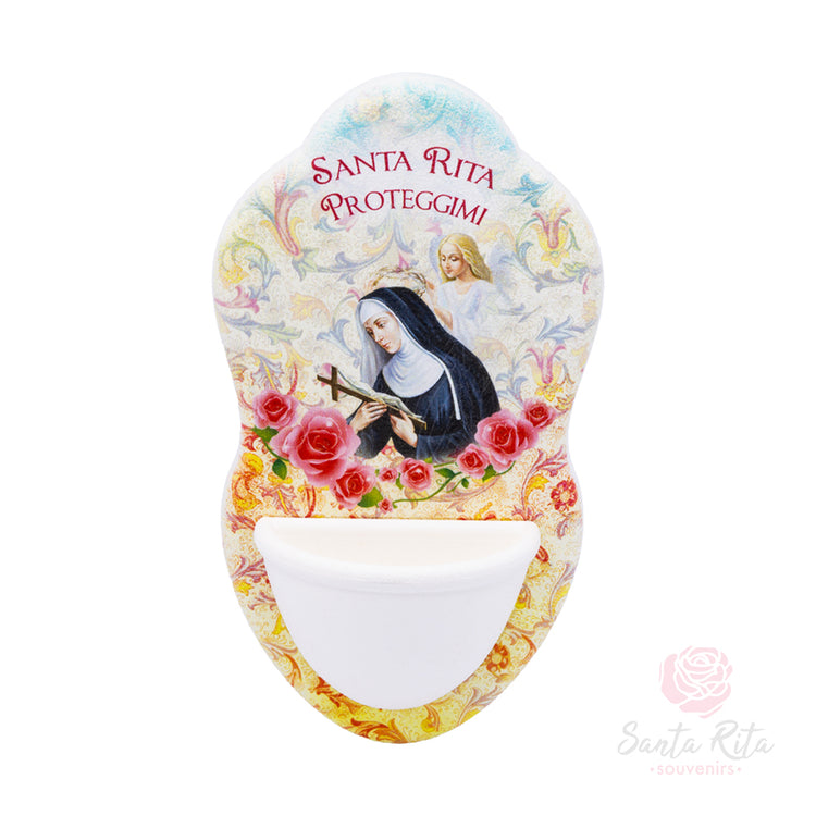 Questa acquasantiera da parete, realizzata in PVC resistente, è arricchita da una stampa vivace e luminosa raffigurante Santa Rita circondata da rose, simbolo della sua intercessione e del suo amore per Cristo. L’angelo sullo sfondo e la scritta “Santa Rita proteggimi” completano la scena, rendendola un punto di riferimento quotidiano per la preghiera e la protezione.