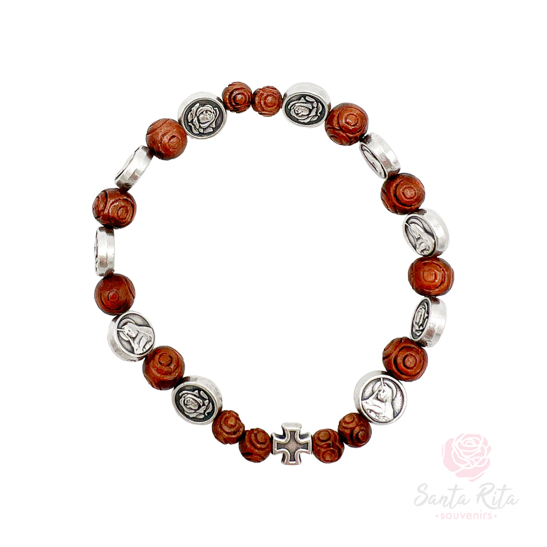 Ogni dettaglio di questo bracciale religioso richiama la fede vissuta con semplicità e intensità. Le medaglie in metallo raffiguranti Santa Rita creano un legame diretto con la Santa, mentre il legno naturale esprime calore umano e autenticità.