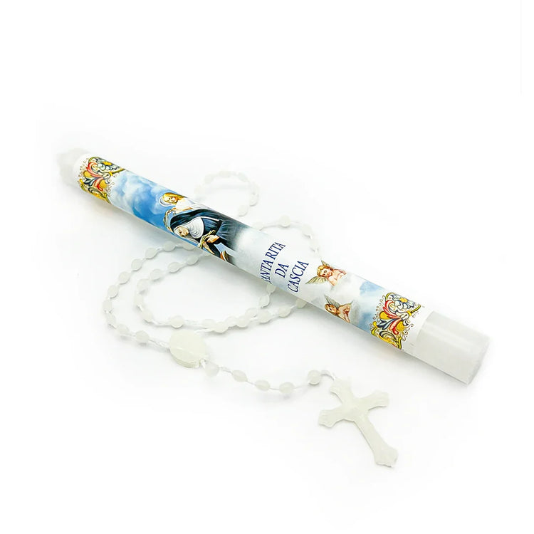 Questa candela religiosa è decorata con una suggestiva immagine di Santa Rita da Cascia, accompagnata da un rosario in plastica bianca. Un simbolo semplice ma potente di fede, perfetto per momenti di preghiera, celebrazioni spirituali o come dono carico di significato. Il packaging trasparente la rende subito pronta da regalare.