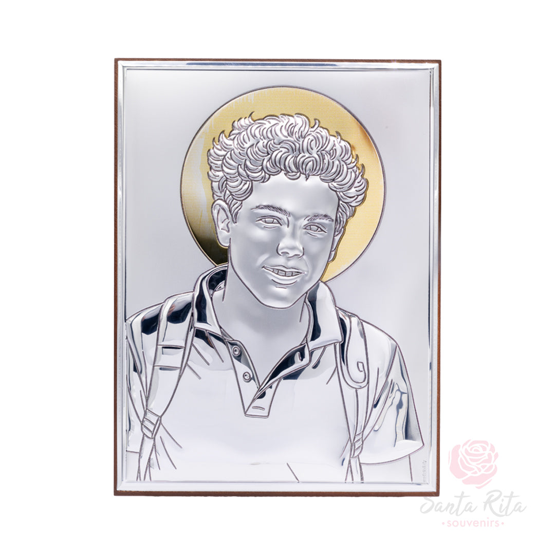 Questo elegante quadro raffigura il Beato Carlo Acutis su un’icona in bilaminato oro, montata su una solida base in legno. Il volto giovane e sorridente del Beato, con zaino in spalla e aureola dorata, lo rende un segno di spiritualità quotidiana, vicino ai cuori delle nuove generazioni. Un oggetto perfetto per case, camere, parrocchie o come dono devozionale.