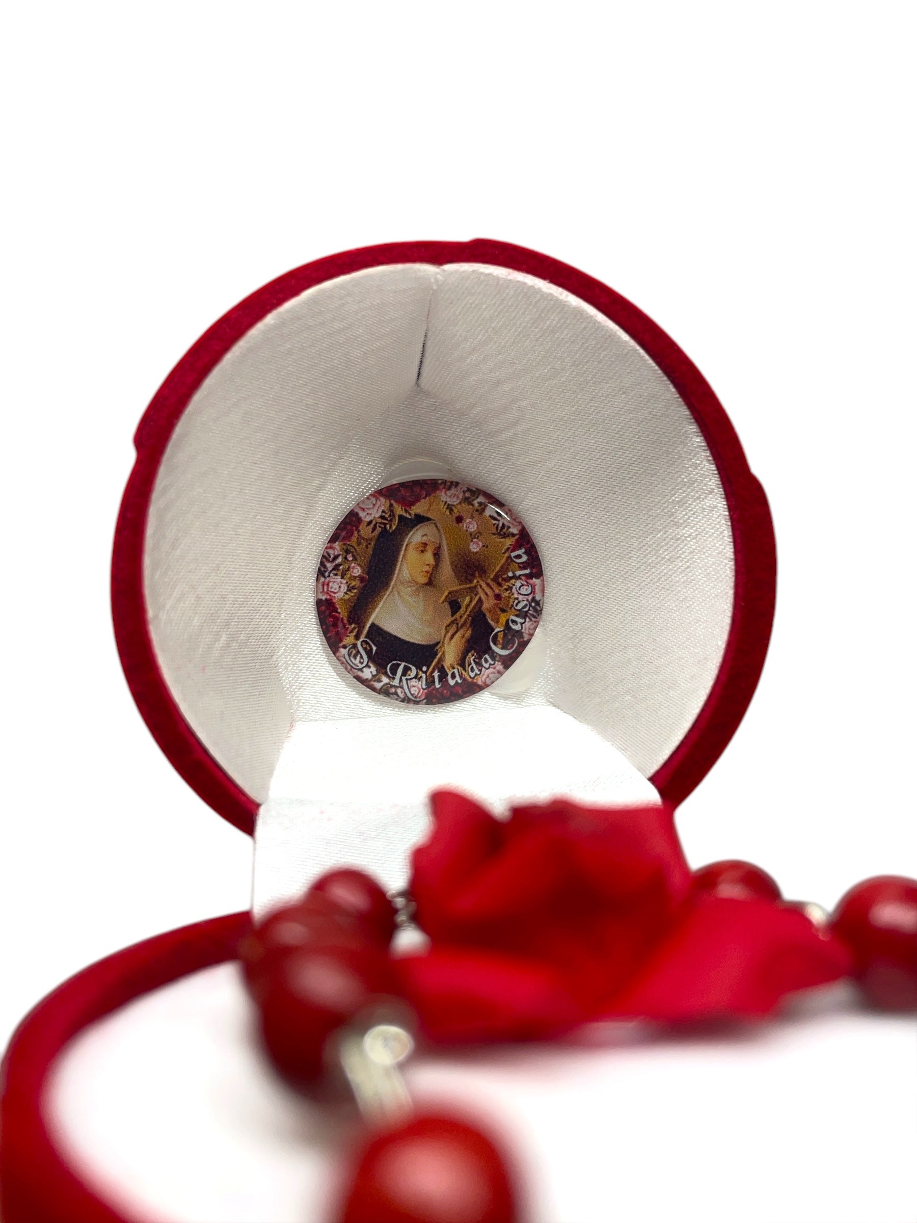 Il cofanetto in velluto a forma di rosa custodisce un’immagine di Santa Rita, una rosellina in ceramica Capodimonte e una decina in legno profumata alla rosa. Un oggetto raffinato che unisce spiritualità e tradizione artigianale, perfetto per chi desidera un simbolo sacro ricco di significato.
