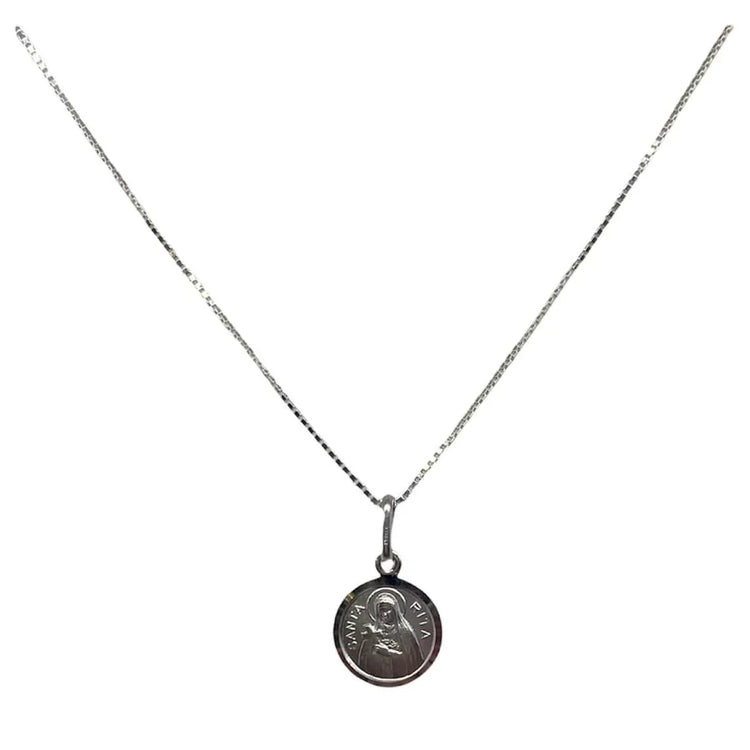 ✨ Elegante collana con medaglia raffigurante Santa Rita realizzata in oro bianco 18 carati, un gioiello devozionale di straordinaria raffinatezza. Ogni medaglia è creata a mano dal nostro maestro orafo umbro, che unisce la tradizione orafa secolare alla devozione per la Santa dei casi impossibili.