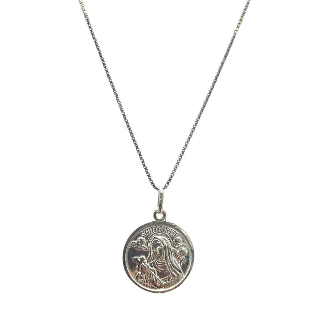 ✨ Materiali e dettagli artigianali La collana è interamente in argento 925, lavorato con cura artigianale per garantire luminosità e resistenza nel tempo. La medaglietta, dalle linee sinuose ed eleganti, raffigura Santa Rita in una posa raffinata che esprime grazia e spiritualità. Ogni pezzo nasce dalla tradizione dell’artigianato umbro, portando con sé la dedizione e l’esperienza dei nostri maestri orafi.