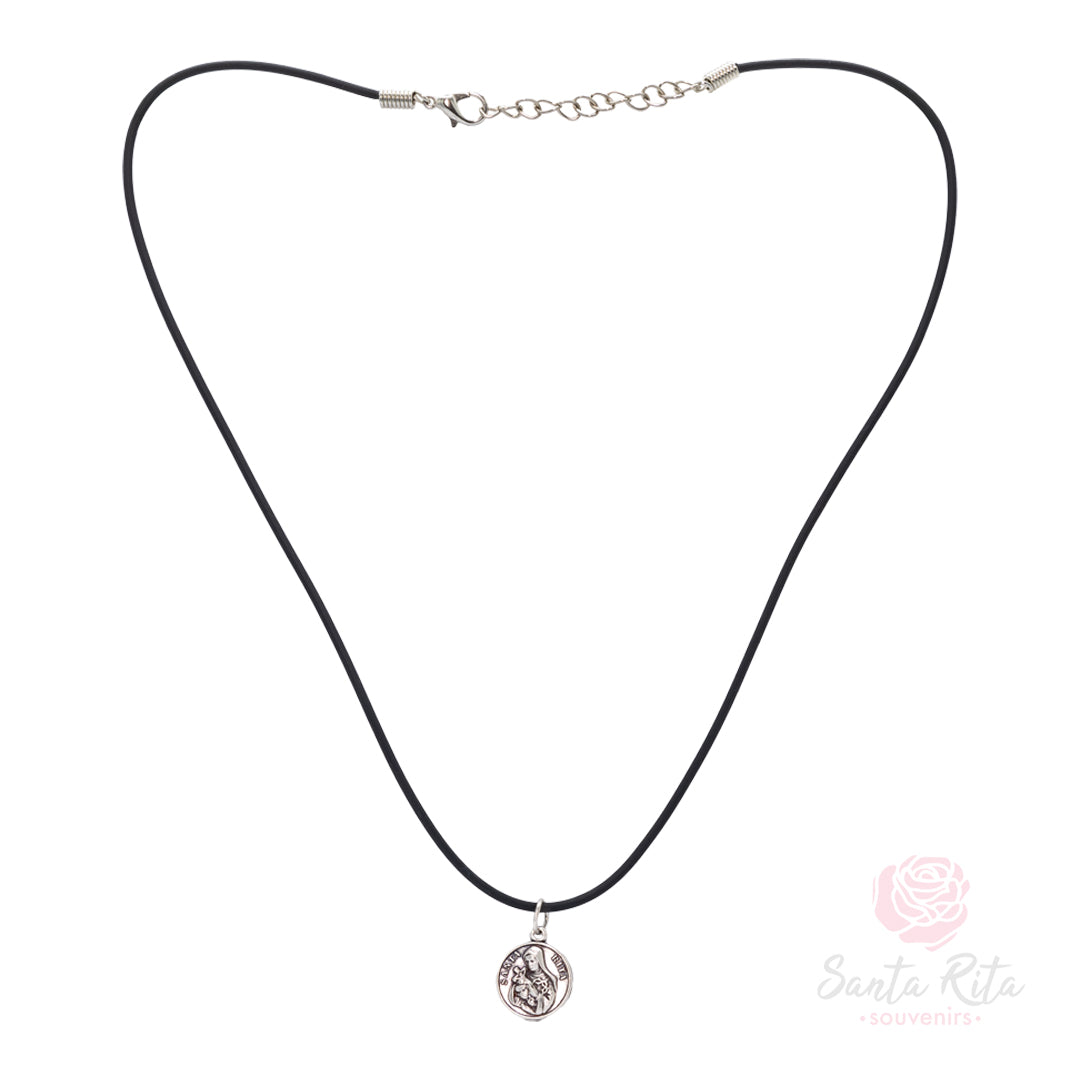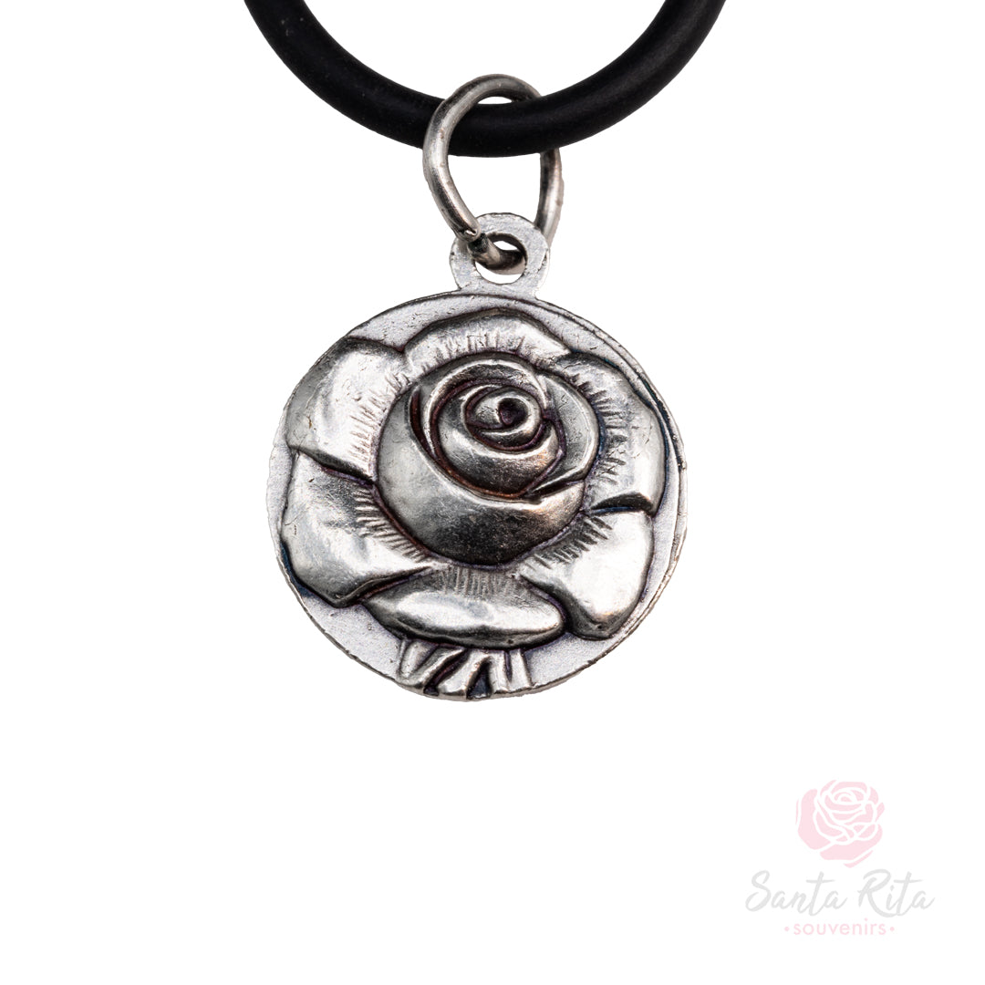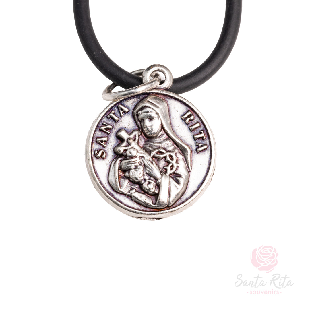 Collana religiosa unisex in caucciù con medaglia double face Santa Rita e rosa.