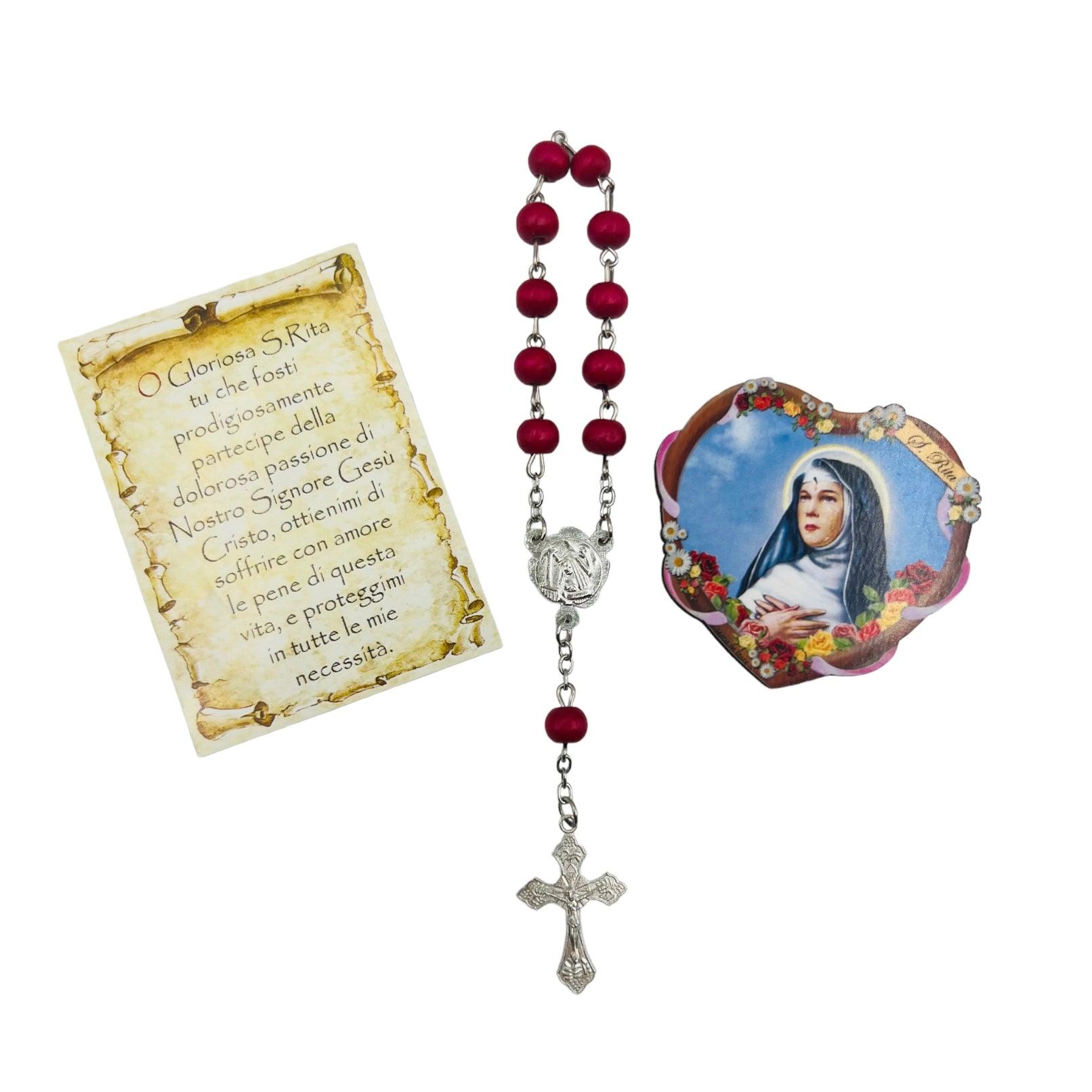 Kit devozionale Santa Rita – preghiera, decina profumata e calamita in legno