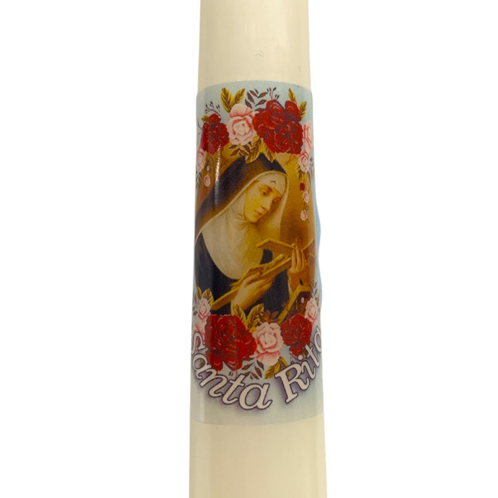 Confezione con candela stampata e rosario di Santa Rita
