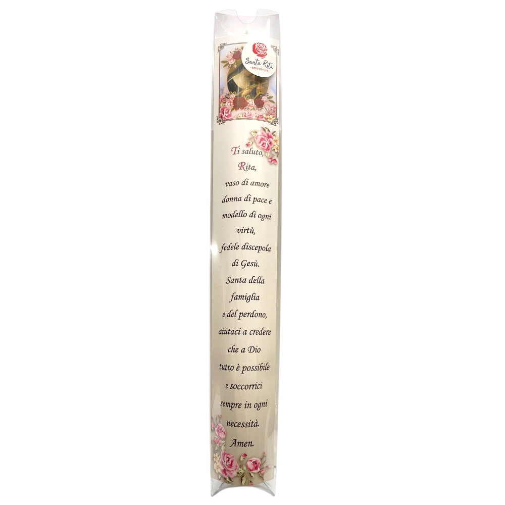 La candela misura 30 cm di altezza, dimensione che la rende adatta sia a un uso liturgico che domestico. Il rosario fluorescente offre praticità e simbolismo, permettendo di pregare anche al buio, in unione spirituale con Santa Rita. Insieme, questi due elementi racchiudono un messaggio di fede, luce e protezione, rendendo la confezione un dono completo e significativo.
