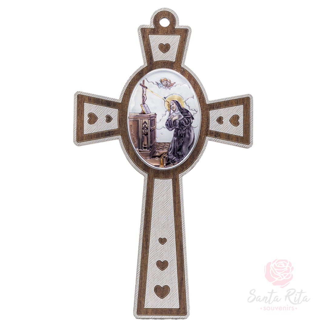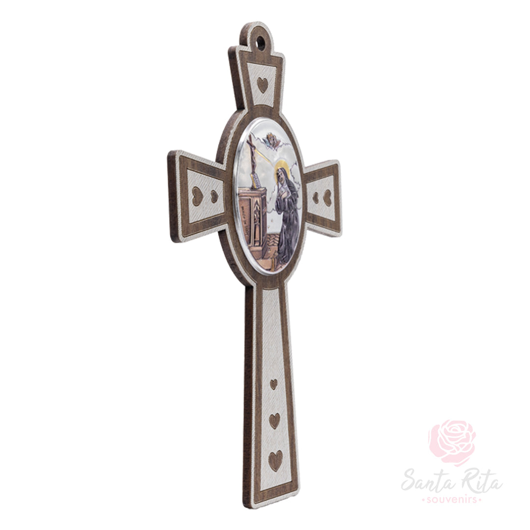 Questa croce in legno con inserti in bilaminato smaltato è un oggetto religioso dal forte valore spirituale ed estetico. Al centro è incastonata una preziosa immagine smaltata che raffigura Santa Rita da Cascia in adorazione dinanzi al Crocifisso, momento che richiama l'episodio mistico della sua stigmatizzazione. I piccoli cuori incisi nei bracci della croce evocano amore, misericordia e intercessione.