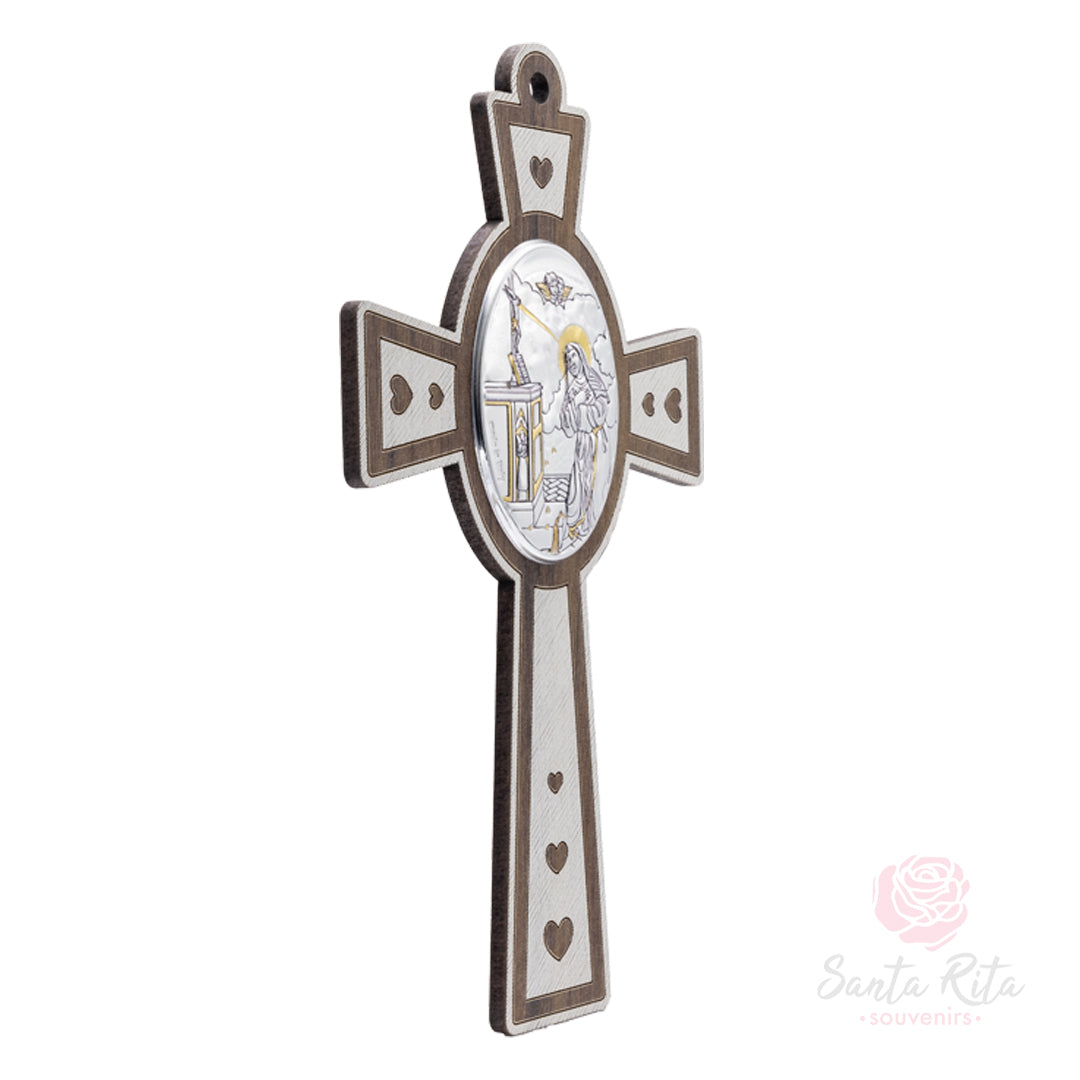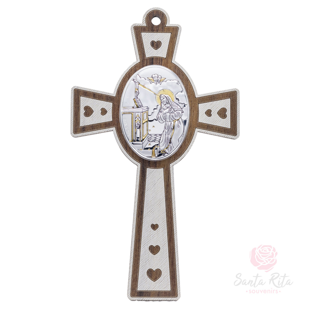 Questa croce in legno con inserti in bilaminato smaltato è un oggetto religioso dal forte valore spirituale ed estetico. Al centro è incastonata una preziosa immagine smaltata che raffigura Santa Rita da Cascia in adorazione dinanzi al Crocifisso, momento che richiama l'episodio mistico della sua stigmatizzazione. I piccoli cuori incisi nei bracci della croce evocano amore, misericordia e intercessione.