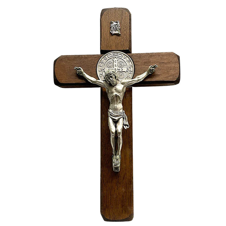 Realizzato in legno naturale con corpo di Cristo in metallo e medaglia di San Benedetto integrata, questo crocifisso da parete unisce la forza simbolica della croce cristiana alla protezione tradizionalmente associata a San Benedetto. La lavorazione curata ne esalta la sobrietà e la forza spirituale, rendendolo un oggetto sacro ideale per chi desidera arricchire il proprio spazio di preghiera con un segno visibile di fede.