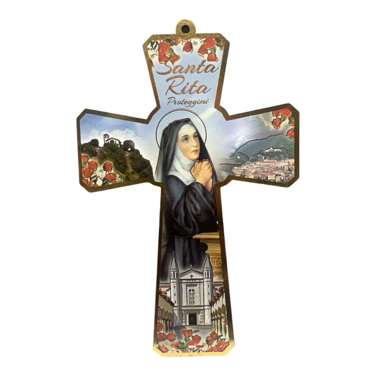 Scopri questa suggestiva croce in legno con immagine di Santa Rita e luoghi sacri di Cascia da 13cm, autentico simbolo di devozione territoriale che unisce la spiritualità della santa ai luoghi che la videro vivere e operare. Un oggetto sacro che porta in casa la presenza spirituale di Santa Rita e la bellezza dei paesaggi umbri. ✨