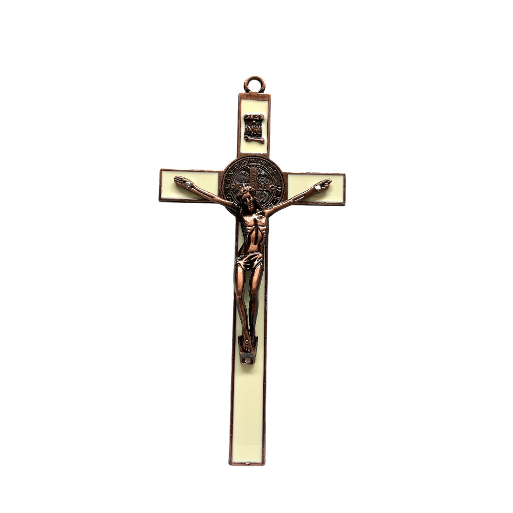 Questa croce di San Benedetto da parete è un oggetto sacro ricco di significato, pensato per chi desidera circondarsi della benedizione e della forza del Santo Patrono contro il male. Lavorata con attenzione in metallo smaltato, unisce la tradizione religiosa alla qualità dell’artigianato italiano.