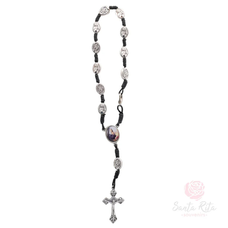 Questa decina in corda cerata nera è impreziosita da grani in zama, che alternano l'effigie di Santa Rita e il simbolo della rosa, con un piccolo crocifisso finemente cesellato. Al centro, un medaglione ovale raffigura Santa Rita in preghiera, evocando la forza della fede e l’intercessione della Santa delle cause impossibili. Ogni dettaglio è frutto dell’artigianato umbro, espressione di spiritualità autentica.
