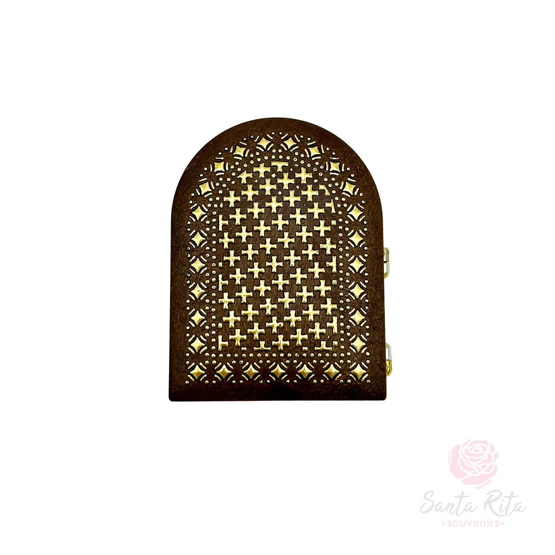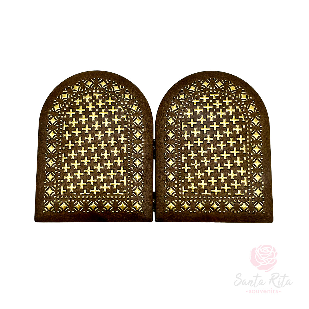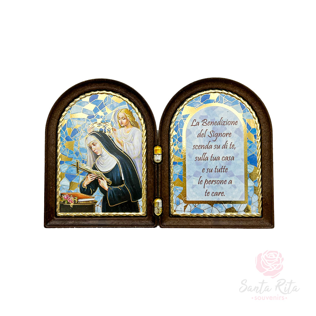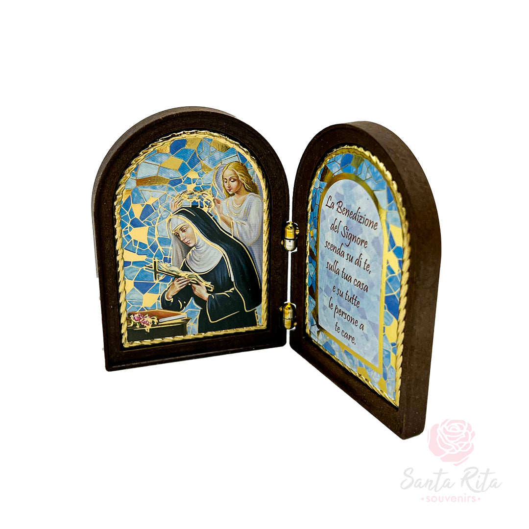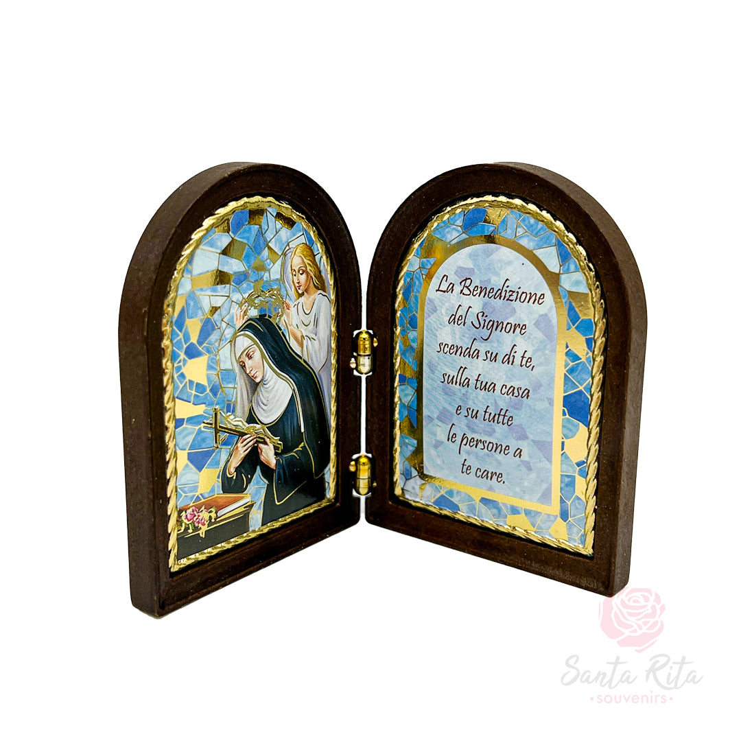Realizzato in legno naturale e rifinito con cura in Umbria, questo dittico misura 7 x 10 cm da chiuso, un formato compatto che lo rende ideale da posizionare su un comodino, una scrivania o all’interno di un piccolo spazio di preghiera. Lavorato con attenzione artigianale, presenta una stampa interna plastificata, resistente e luminosa, con immagine di Santa Rita e preghiera. Il prodotto è ispirato alla spiritualità del Santuario di Cascia e viene consegnato in una confezione protettiva, pronta per essere donata.