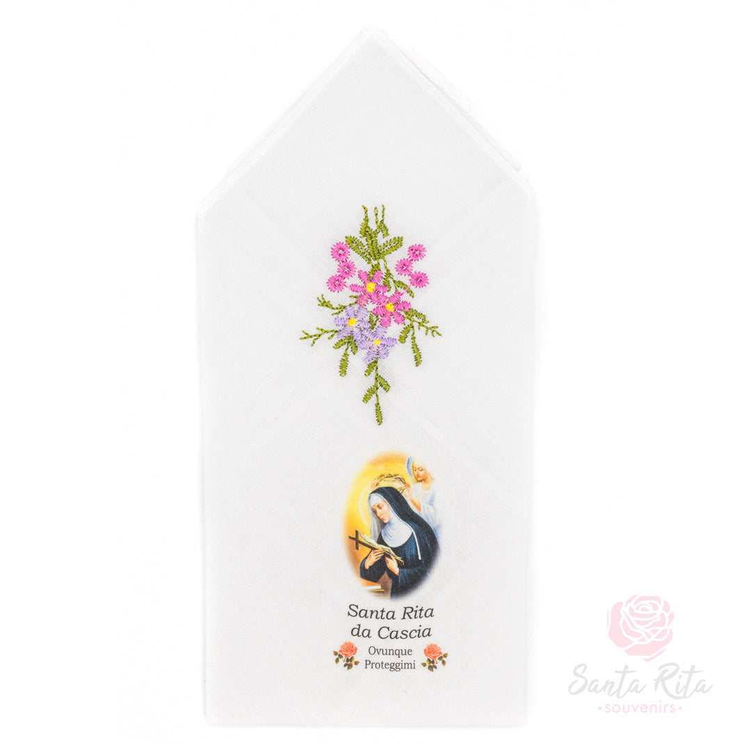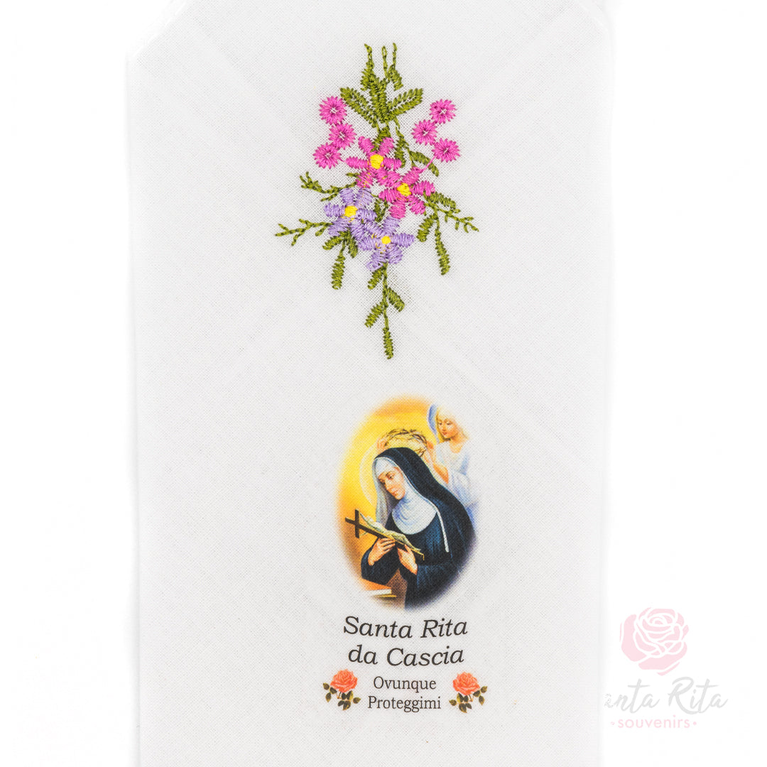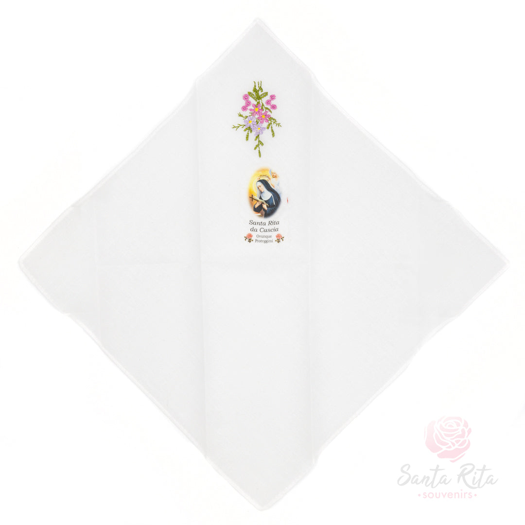 Questo fazzoletto in tessuto chiaro è arricchito da un ricamo floreale realizzato a mano e dalla raffigurazione di Santa Rita con la scritta “Ovunque proteggimi”. Un oggetto semplice ma ricco di significato, prodotto in Italia, pensato per chi desidera portare nel quotidiano la presenza spirituale della Santa delle cause impossibili.