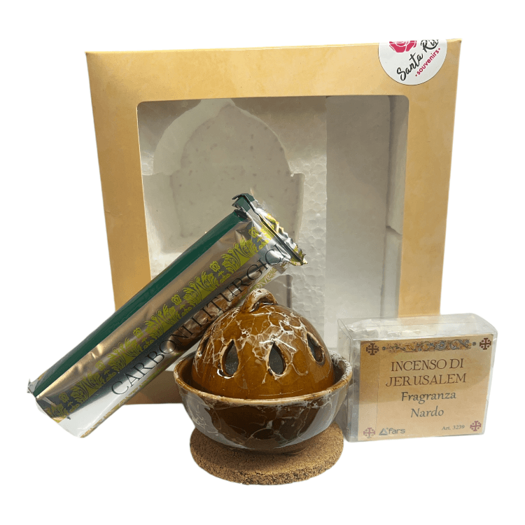 Questo elegante set per l’incenso unisce funzionalità e spiritualità, ed è pensato per creare un’atmosfera di pace durante la meditazione o la preghiera. Include un brucia incenso in ceramica artigianale, 10 carboncini, 40 grammi di incenso di Gerusalemme al profumo di Nardo e un disco in sughero isolante per proteggere le superfici. Il tutto è racchiuso in una raffinata confezione regalo con box protettivo, pronta per essere donata.