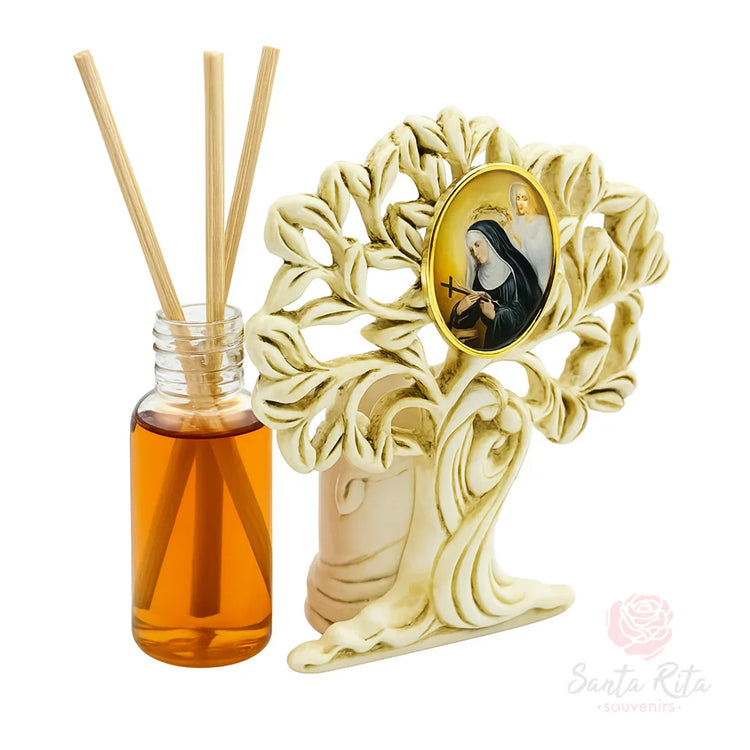Questo elegante profumatore è composto da una boccetta di vetro con essenza alla rosa e da un albero in resina decorato con l’immagine di Santa Rita da Cascia. L’albero, simbolo di vita e protezione, è lavorato con cura e rifinito con tonalità avorio e oro, rendendolo un oggetto adatto a ogni ambiente della casa. Oltre a profumare delicatamente lo spazio, dona una presenza spirituale ispirata alla fede.
