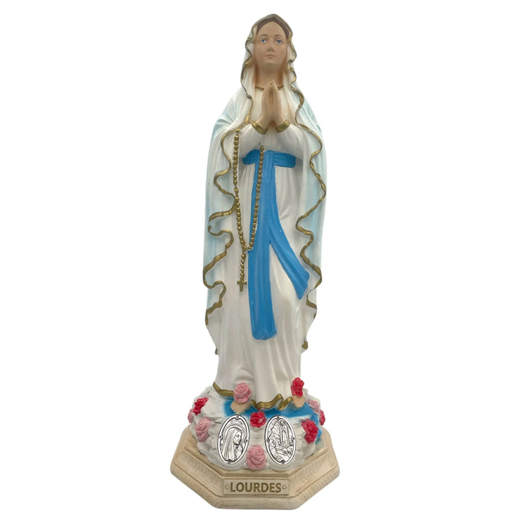 Le decorazioni curate e il volto espressivo rendono omaggio alla Vergine apparsa a Lourdes. Prodotta in quantità limitate con lavorazione artigianale, ogni pezzo è unico e ricco di spiritualità. Resistente agli agenti atmosferici, è adatta anche per giardini, edicole votive e spazi aperti. Disponibile in due misure (20 cm e 40 cm).