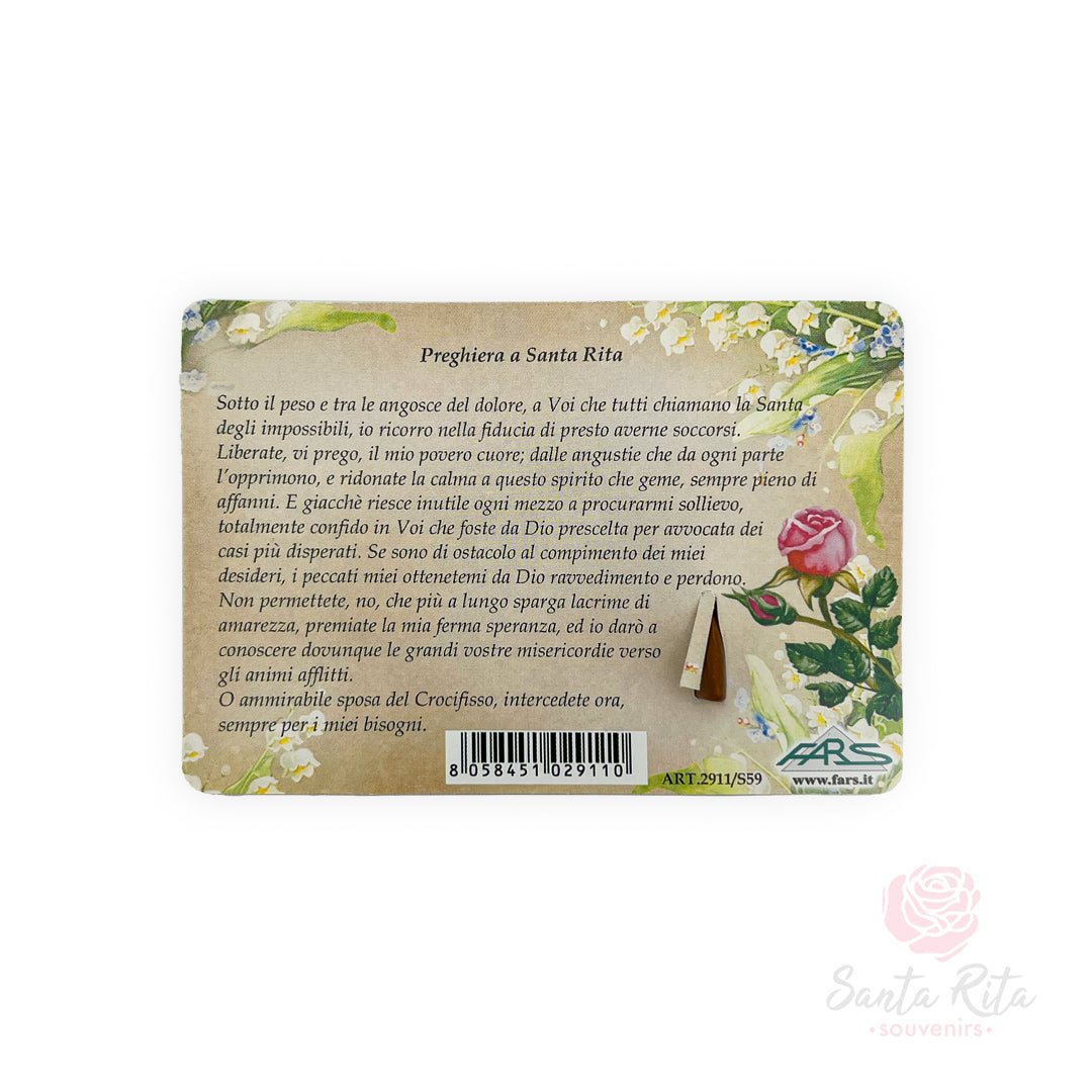 Quadretto religioso compatto con Santa Rita e preghiera stampata, ideale per la preghiera quotidiana o come piccolo segno di devozione.