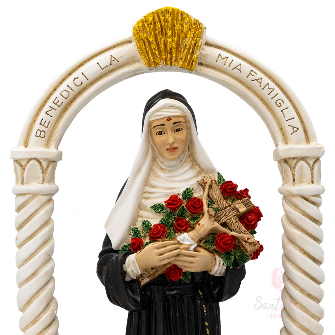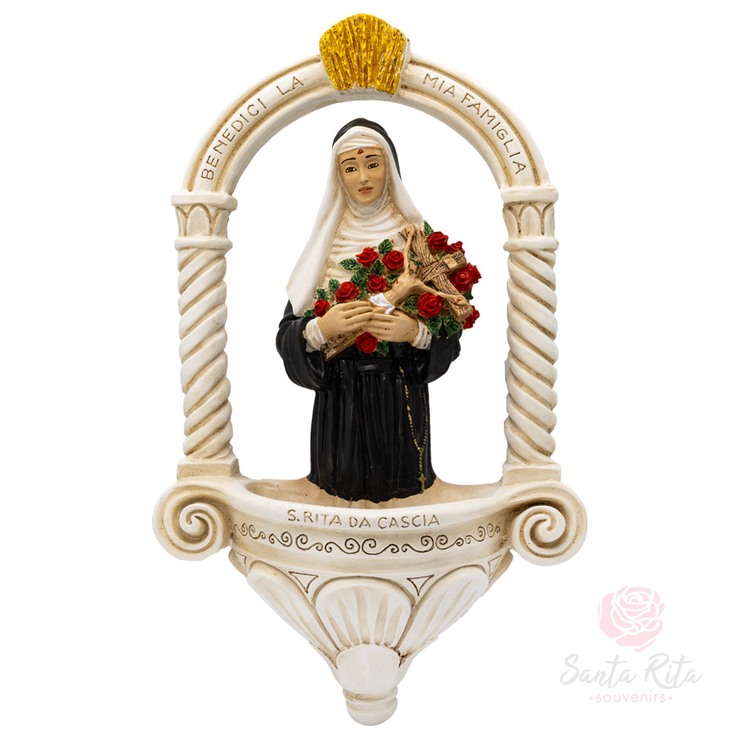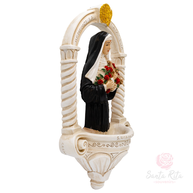 Acquasantiera artigianale ad arco con Santa Rita a mezzo busto con rose e croce, un'opera d'arte sacra che unisce eleganza architettonica e devozione, perfetta per portare la benedizione dell'acqua santa nella tua casa.