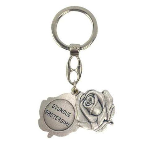 Scopri la bellezza di questo portachiavi a forma di rosa apribile in metallo rodiato, un piccolo scrigno di fede da portare con te ogni giorno. Elegante e significativo, si apre come un medaglione rivelando due immagini di Santa Rita.