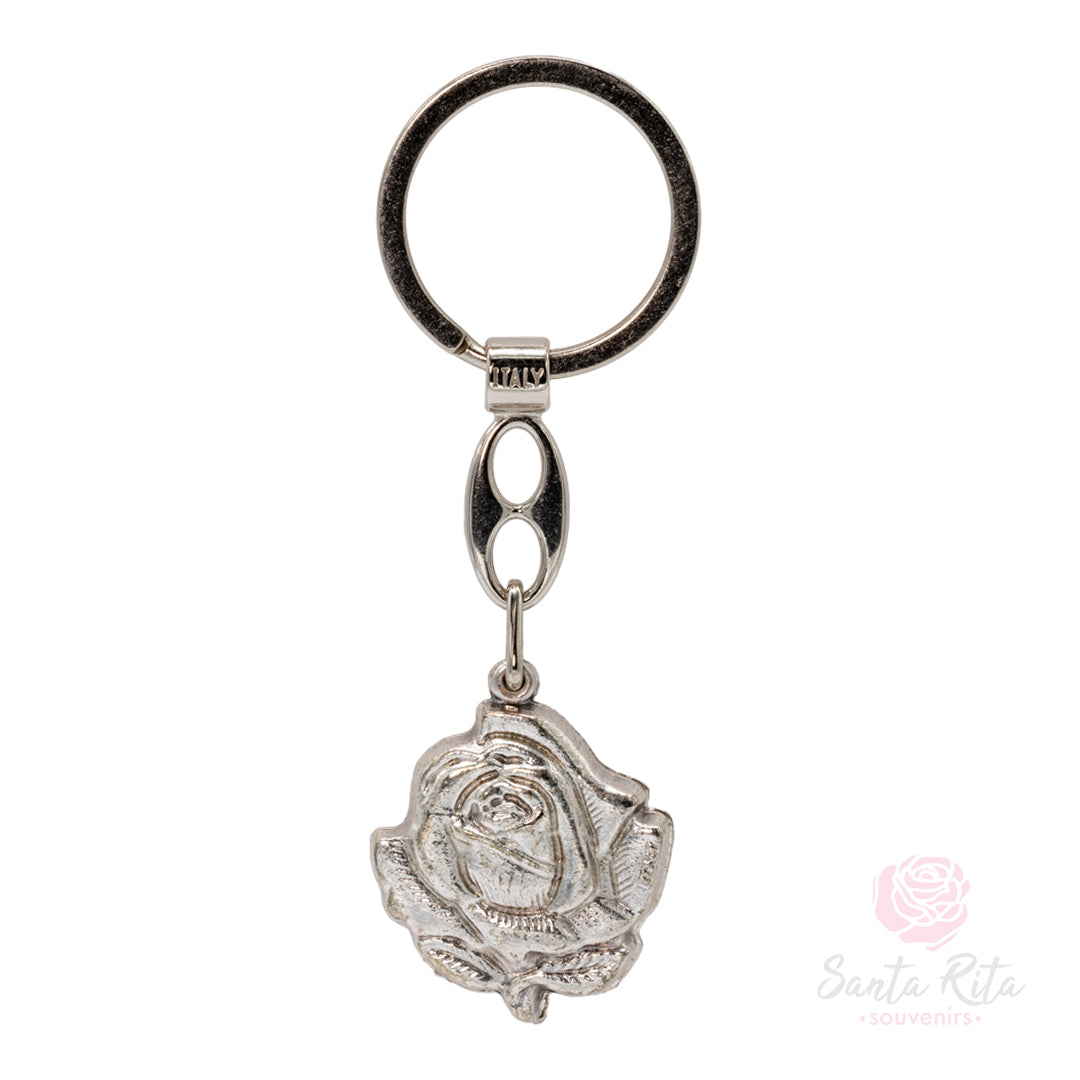 Elegante portachiavi a forma di rosa apribile in metallo rodiato, un piccolo scrigno di fede da portare con te ogni giorno. Si apre come un medaglione rivelando due immagini di Santa Rita. ✨
