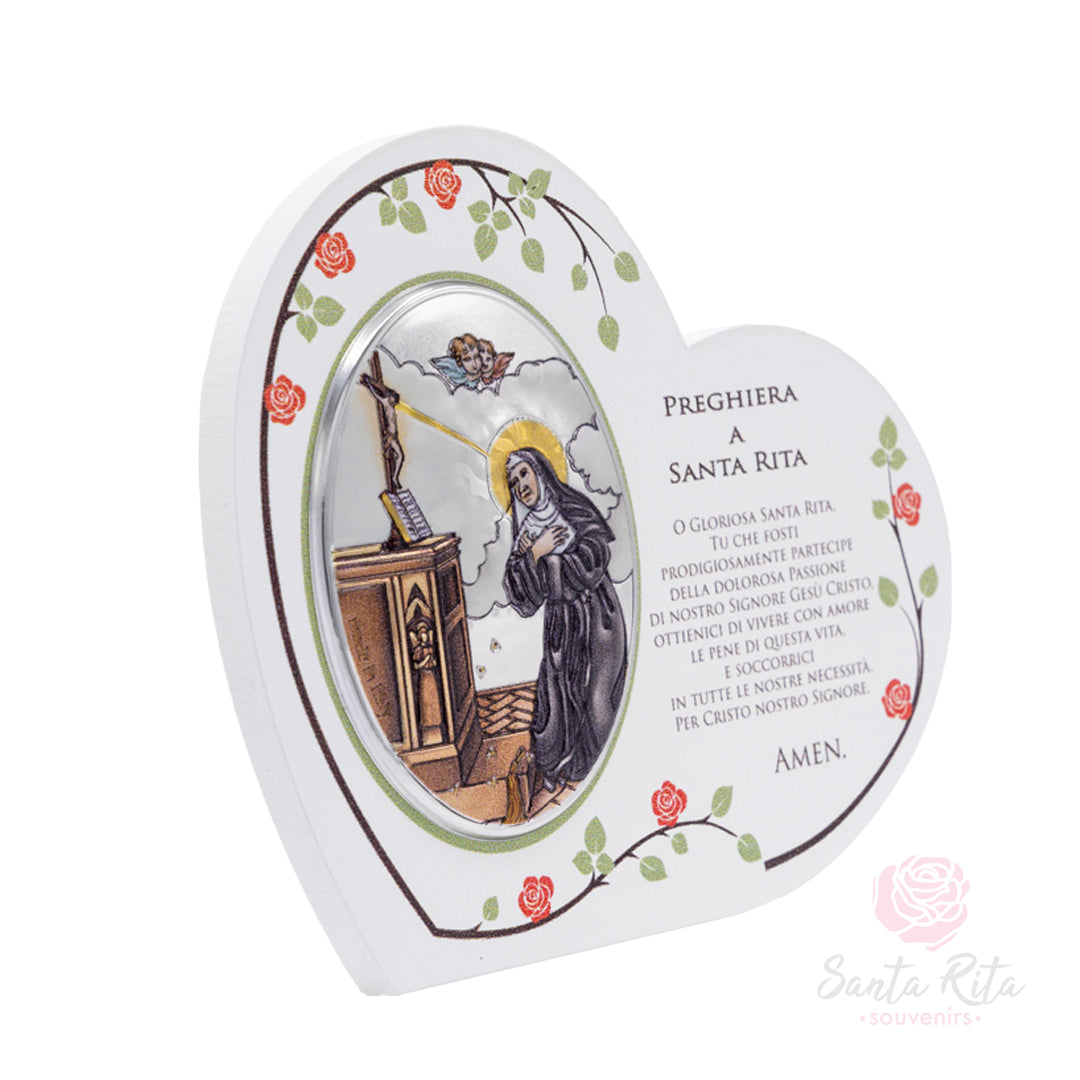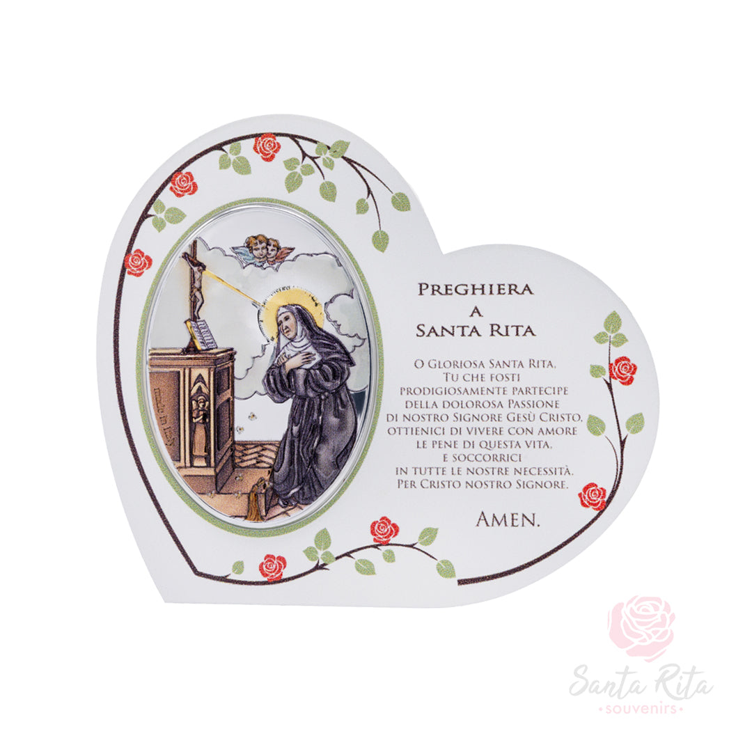 Questo raffinato quadretto devozionale raffigura Santa Rita da Cascia in preghiera davanti al Crocifisso, realizzato in bilaminato oro e incastonato su una base in legno sagomata a forma di cuore. Disponibile in due formati – grande o piccolo – è pensato per adattarsi con grazia a ogni spazio della casa. L’immagine in rilievo e la preghiera stampata trasformano questo oggetto in una presenza viva di fede, amore e intercessione.