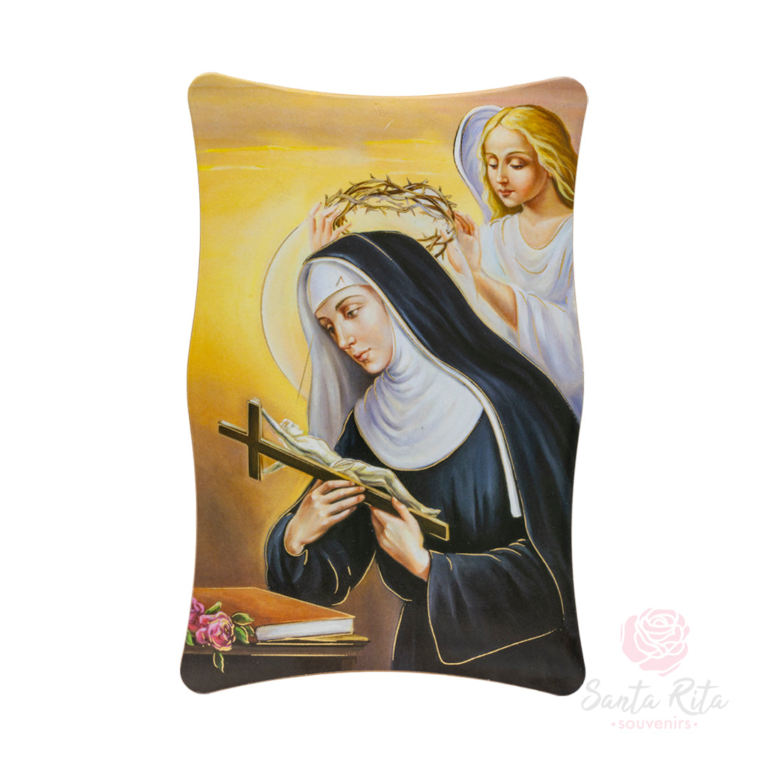 Quadretto religioso semplice ed essenziale stampato su PVC, realizzato artigianalmente in Umbria. Raffigura Santa Rita da Cascia in un'immagine intensa e spirituale. ✨