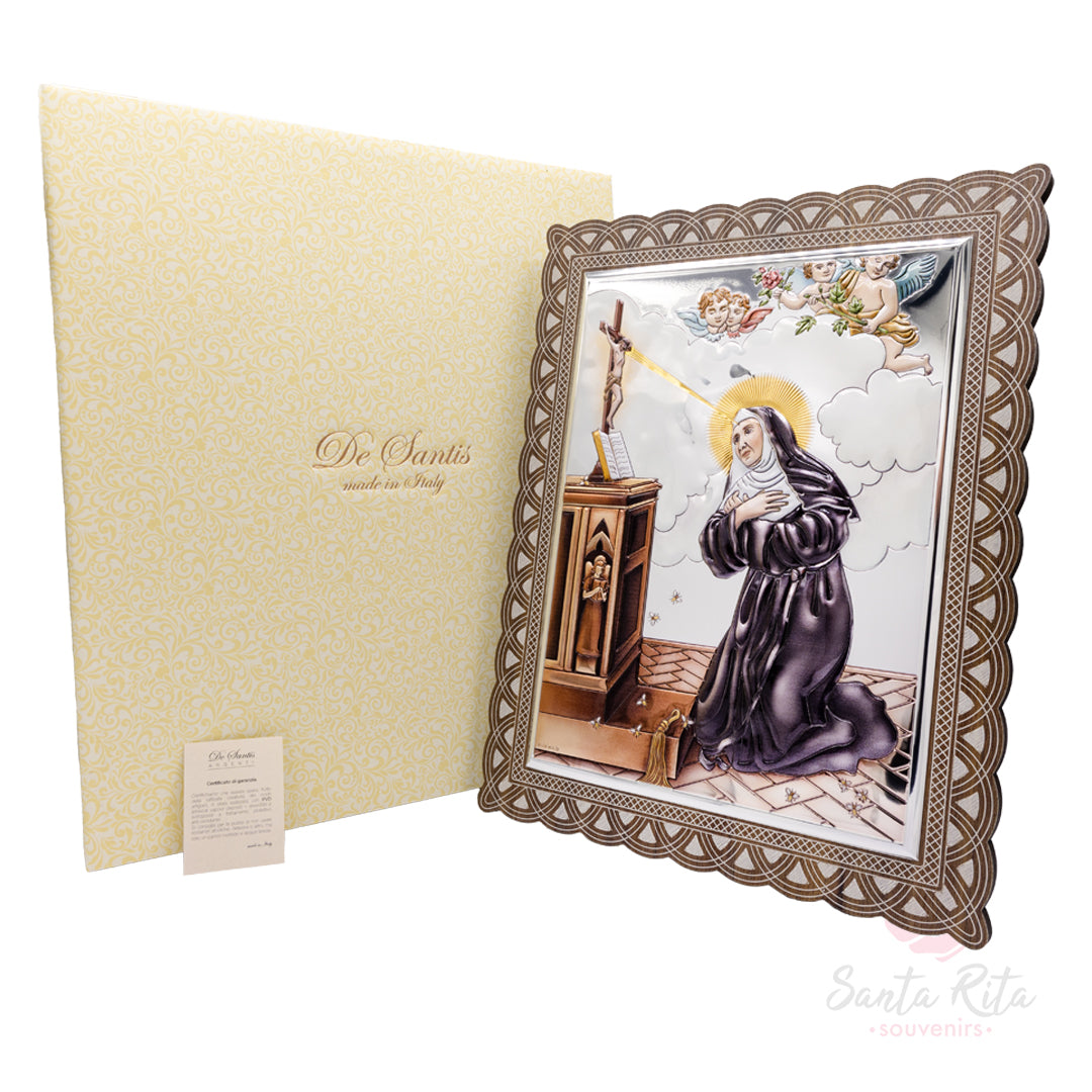 Questo quadro religioso, realizzato in bilaminato e interamente prodotto in Italia, raffigura uno degli episodi più mistici della vita di Santa Rita da Cascia: la ricezione della spina mentre prega davanti al crocifisso. Una scena di grande forza spirituale, racchiusa in una cornice finemente lavorata, pensata per ispirare raccoglimento e protezione in ogni ambiente.