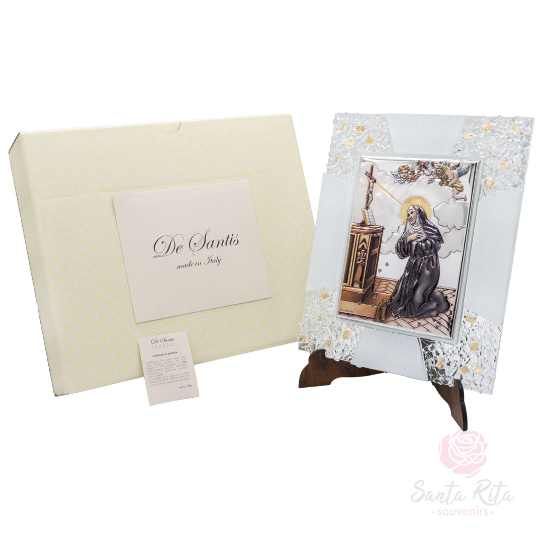 Quadretto artigianale in vetro di Murano con placca Santa Rita e dettagli dorati, made in Italy