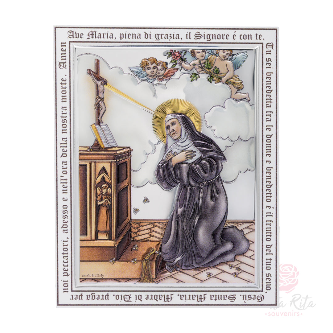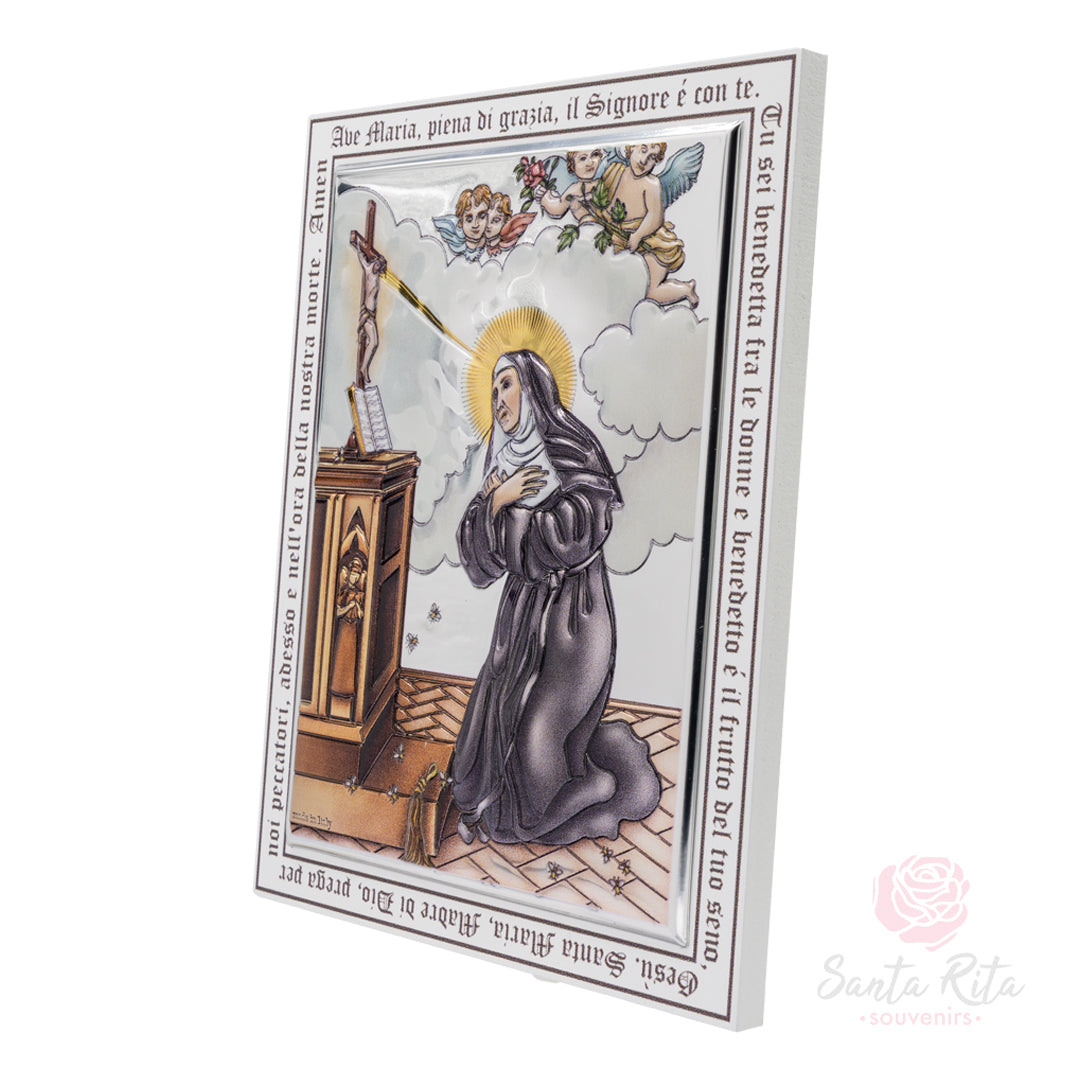 Questo quadro religioso in bilaminato smaltato raffigura Santa Rita da Cascia con intensità e delicatezza, in un momento di profonda preghiera davanti al Crocifisso. L’immagine, ricca di pace e raccoglimento, rinnova la fiducia nell’intercessione della Santa delle cause impossibili.