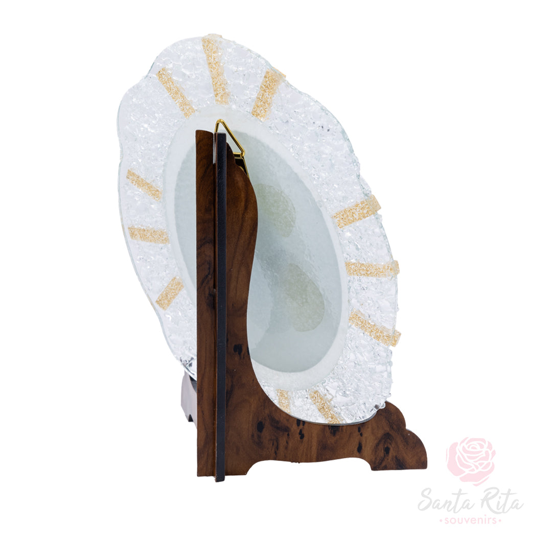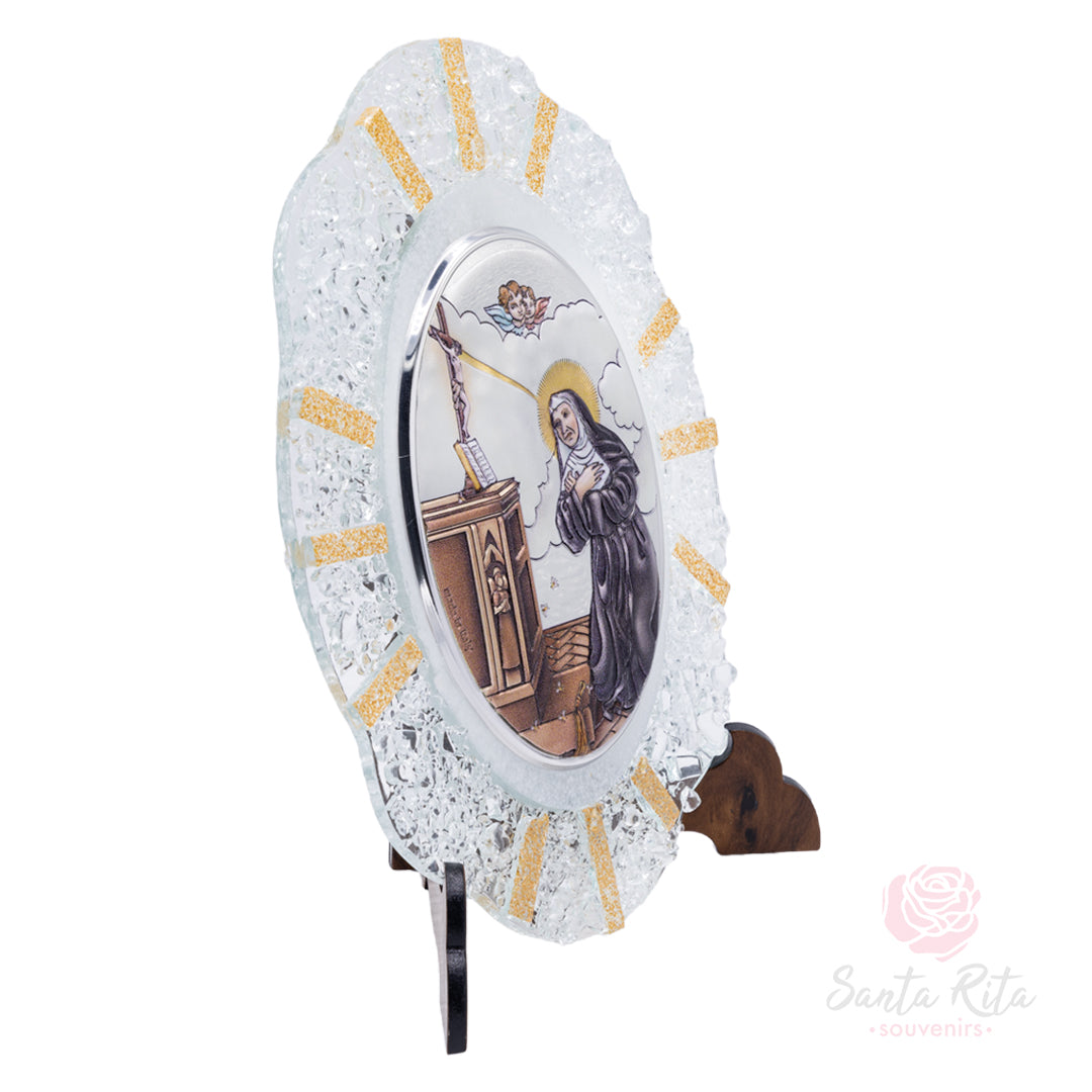 Quadretto artigianale raffigurante Santa Rita inginocchiata in preghiera mentre riceve la spina dalla corona di Cristo.
