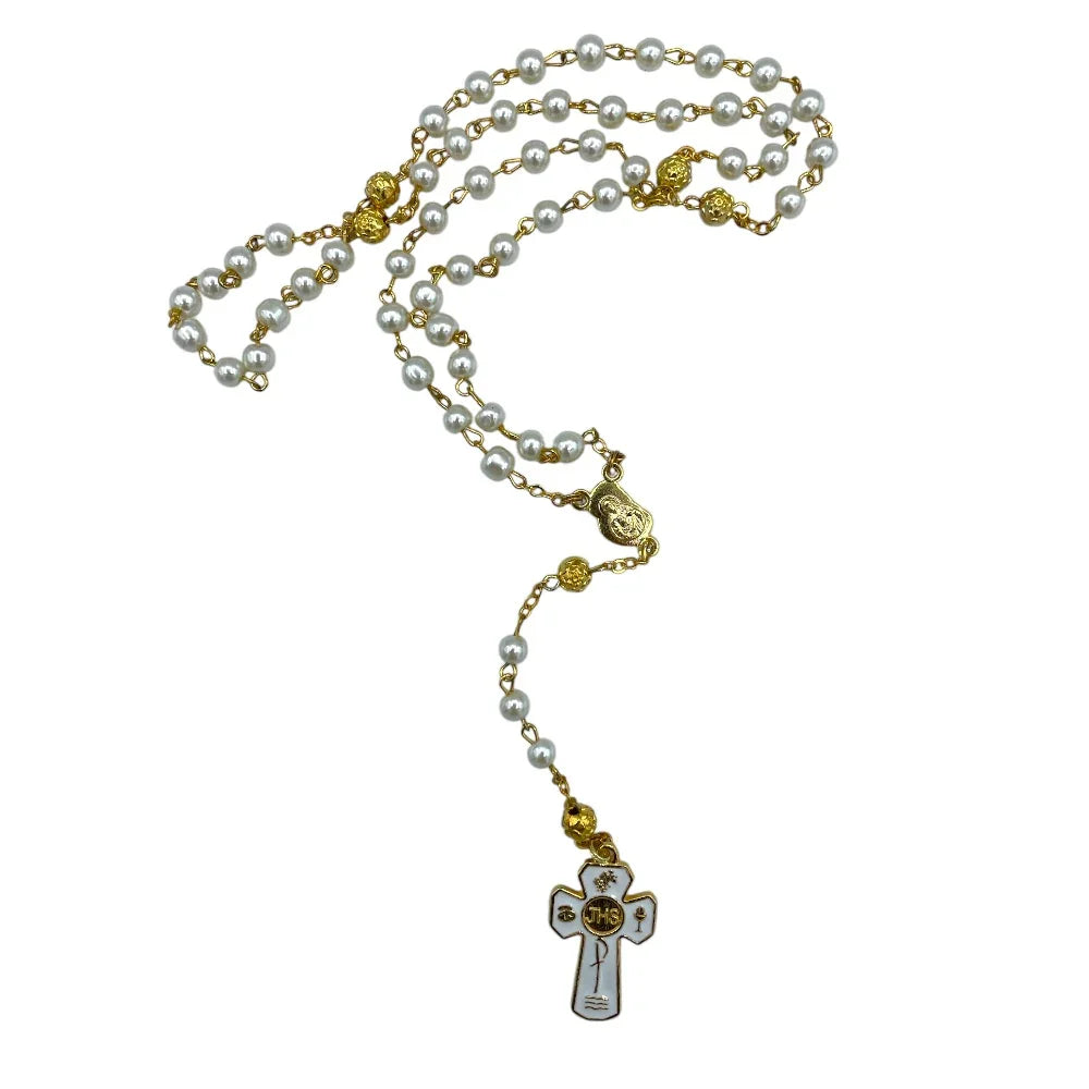 Un rosario sacramentale di straordinaria eleganza, pensato appositamente per celebrare il momento più importante nella vita spirituale di un bambino: la Prima Comunione. Questo gioiello religioso unisce la lucentezza del metallo dorato alla delicatezza dei grani effetto perla, creando un oggetto di devozione che accompagnerà il bambino nel suo cammino di fede.