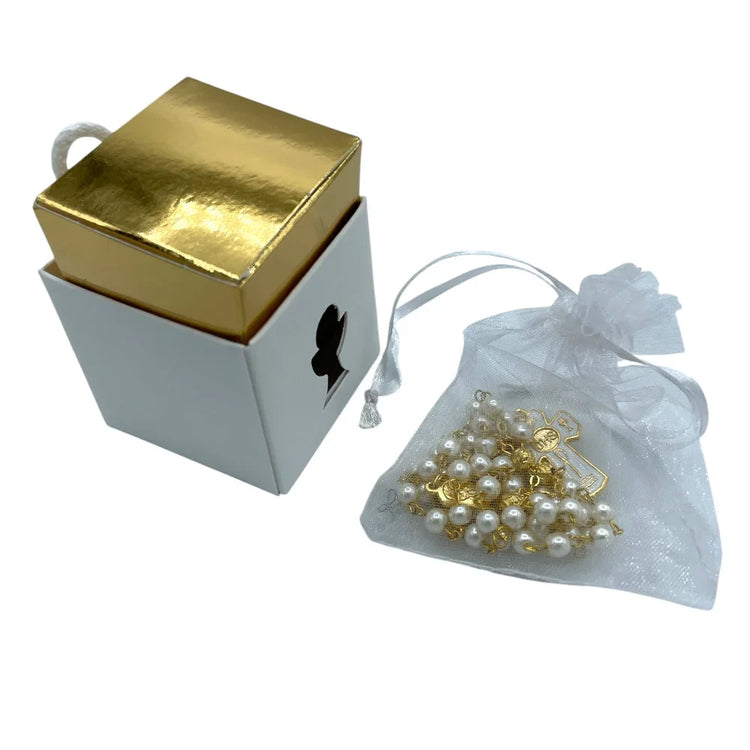Ogni rosario viene presentato in una elegante scatolina bianca con angelo stilizzato e coperchio dorato, accompagnata da una bustina organza trasparente. Questa doppia confezione rende il rosario perfetto come bomboniera o dono spirituale, pronto per essere consegnato senza bisogno di ulteriori preparazioni.