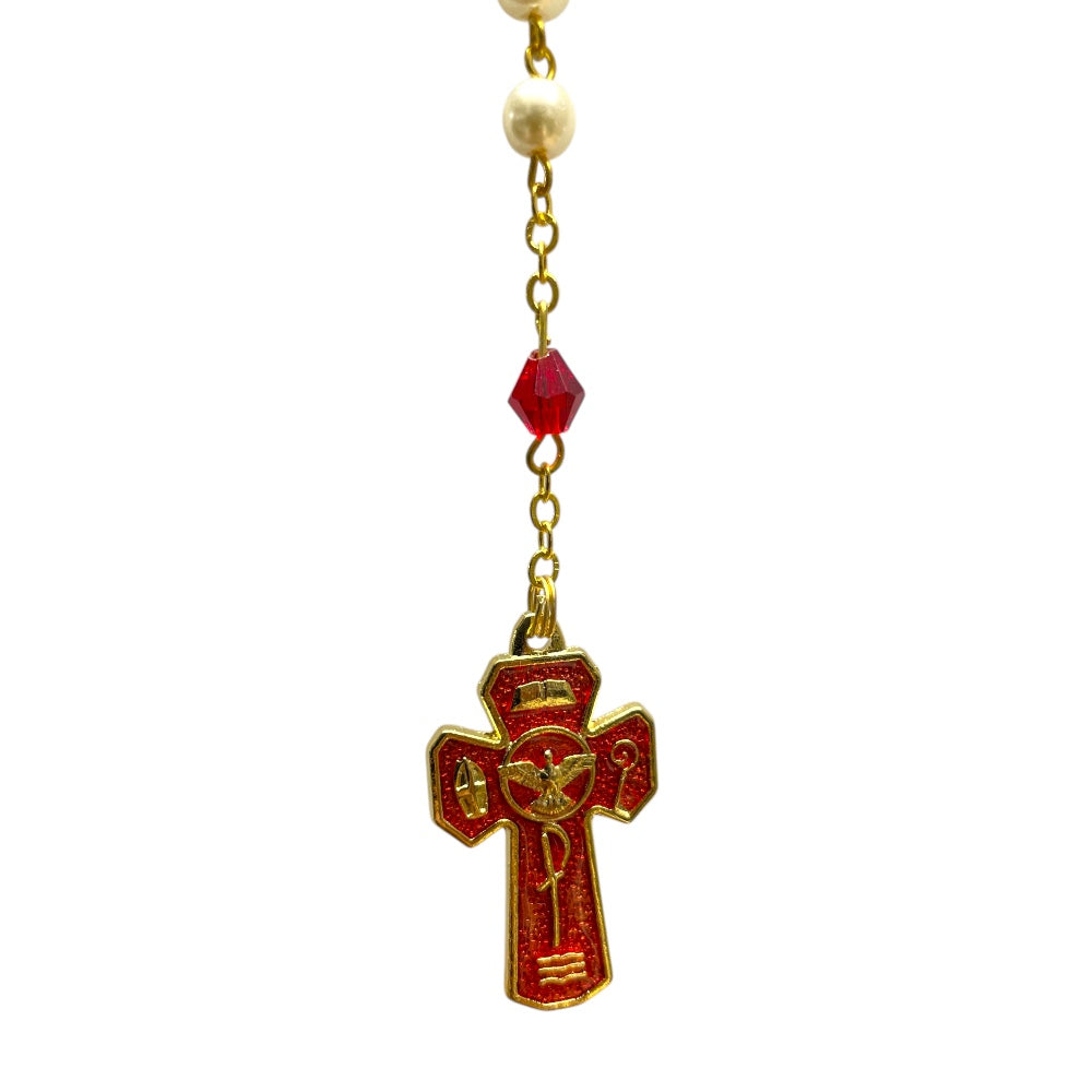 Questo rosario da Cresima si distingue per i suoi grani a forma di perla, eleganti e luminosi, uniti da una catenella dorata. Al centro spicca una medaglietta raffigurante il volto di Gesù, mentre la croce finale, smaltata in rosso intenso con dettagli dorati, richiama i simboli dello Spirito Santo e del sacramento della Confermazione. Il rosario è custodito in un’elegante scatolina bianca con coperchio dorato, decorata con una colomba simbolo dello Spirito Santo, e accompagnato da sacchetto in organza: perfetto come dono pronto da consegnare.