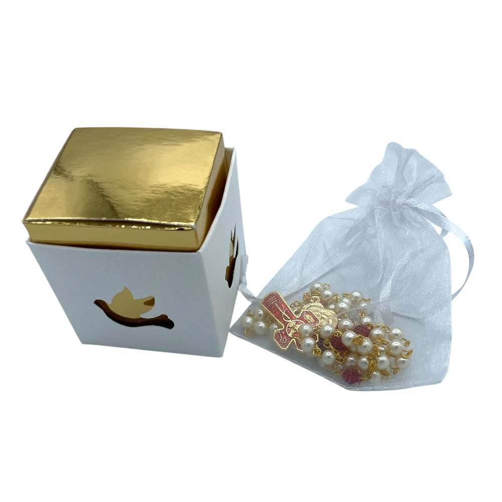📦 Scatola regalo inclusa con coperchio dorato 🎀 Rosario custodito in sacchetto in organza bianca 🔔 Design elegante e simbolico, perfetto per cerimonie ✉️ Ideale anche come bomboniera religiosa