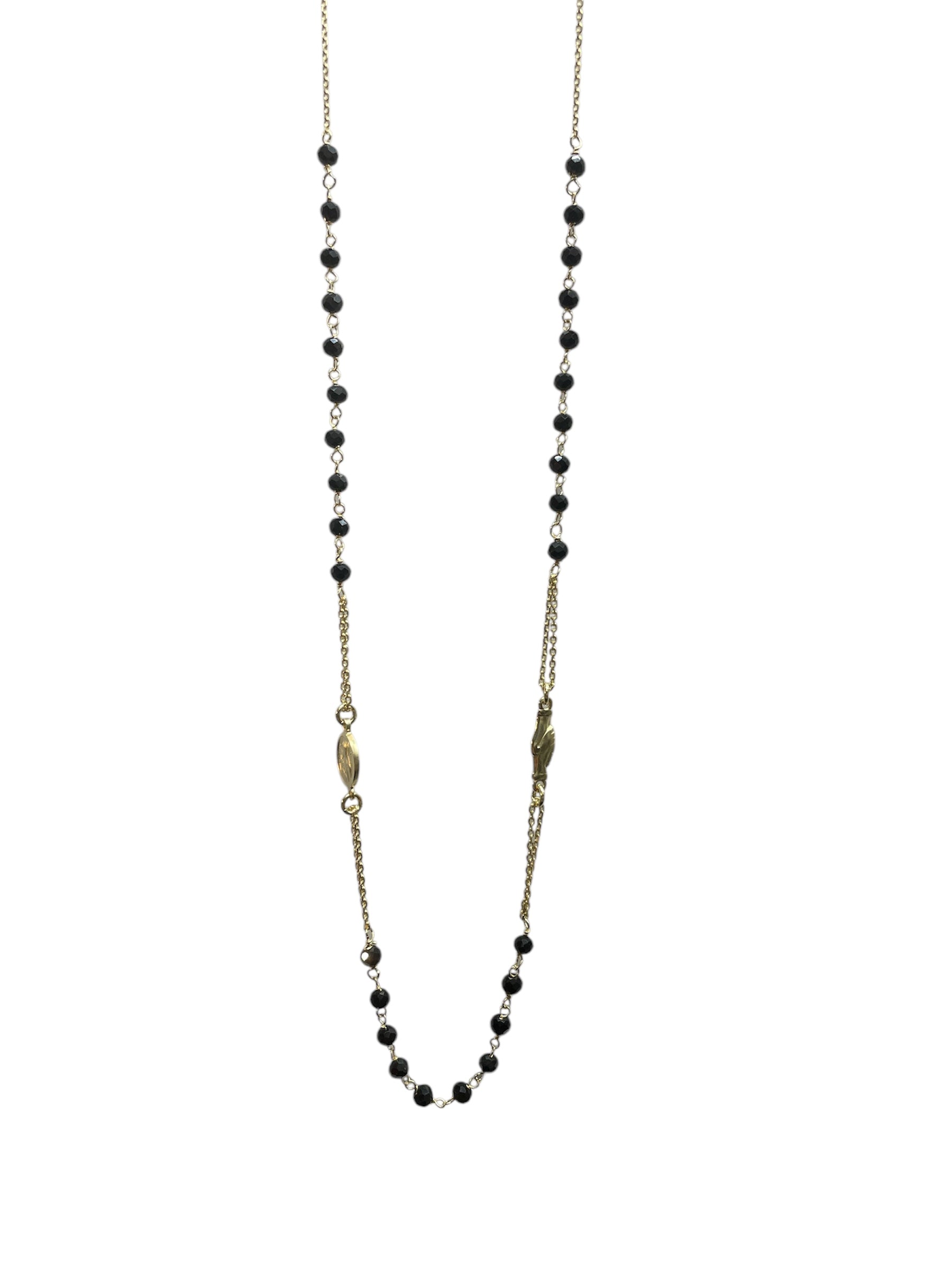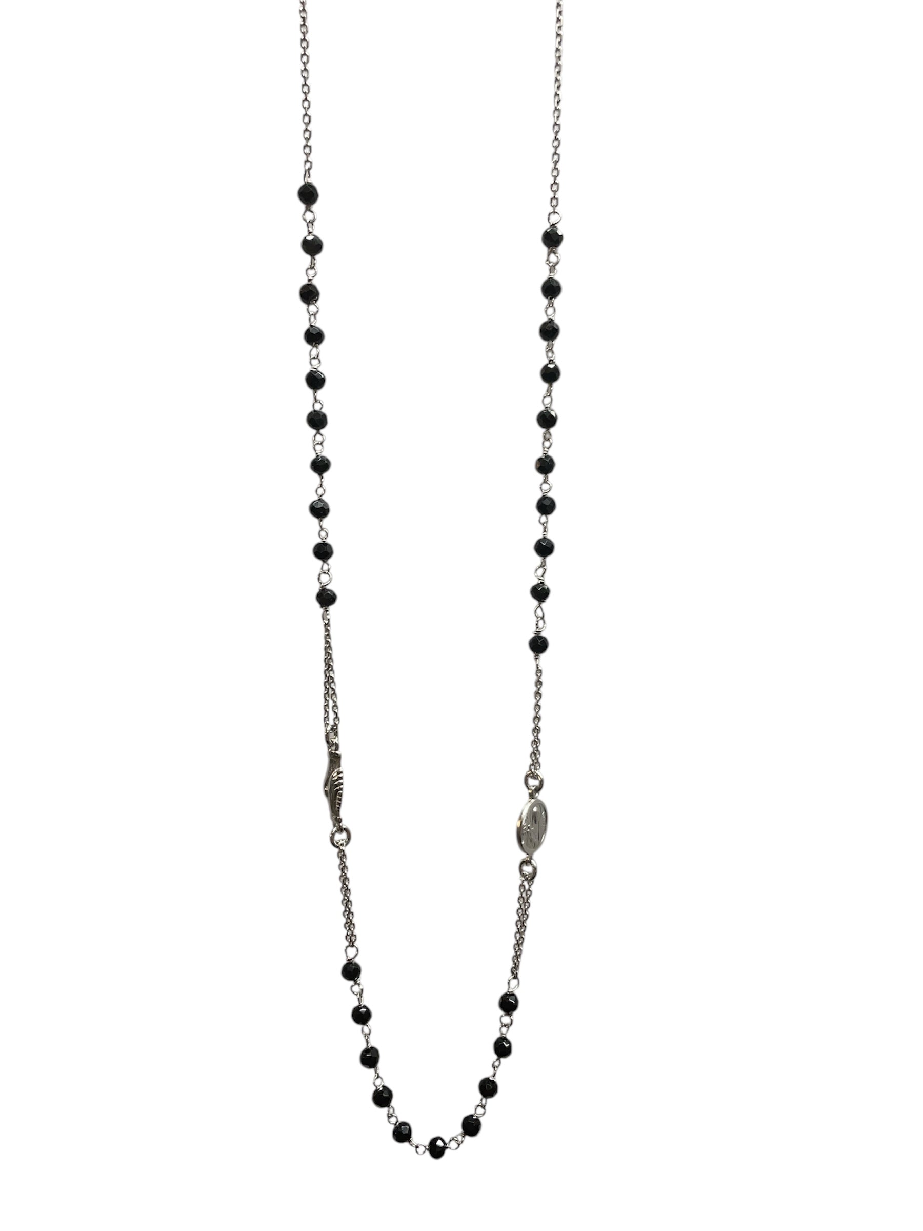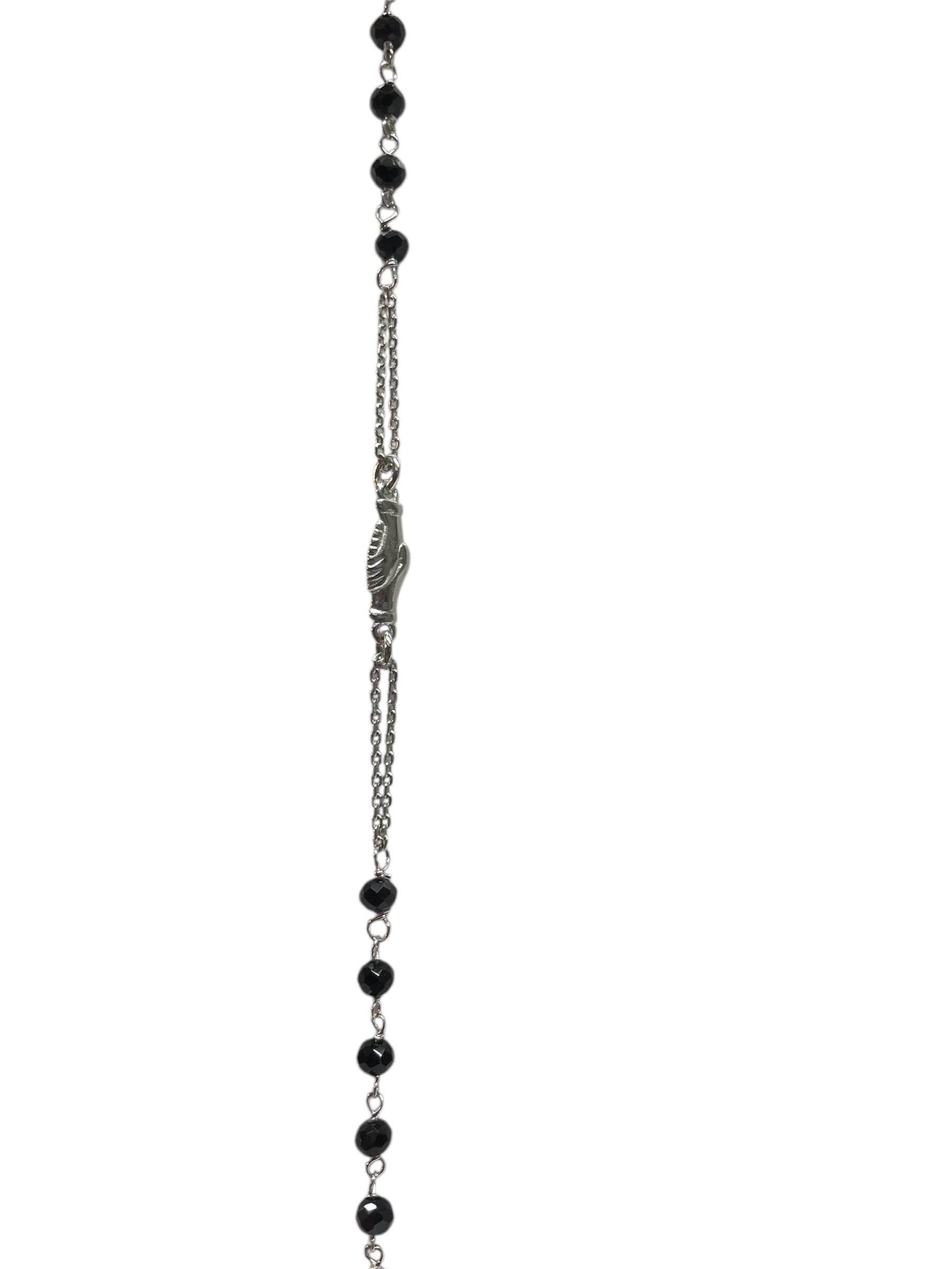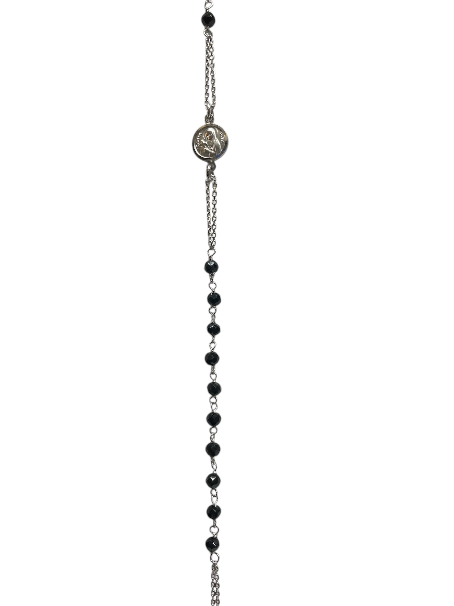 Realizzato a mano in Umbria in esclusiva per Santa Rita Souvenirs, questo rosario girocollo a 3 misteri è composto da catena in argento 925 e grani in cristallo nero. Sul lato si trovano una medaglia coniata di Santa Rita e le due mani che si stringono, simbolo della fede nuziale della Santa. Una creazione raffinata e originale, che unisce spiritualità e gusto contemporaneo.