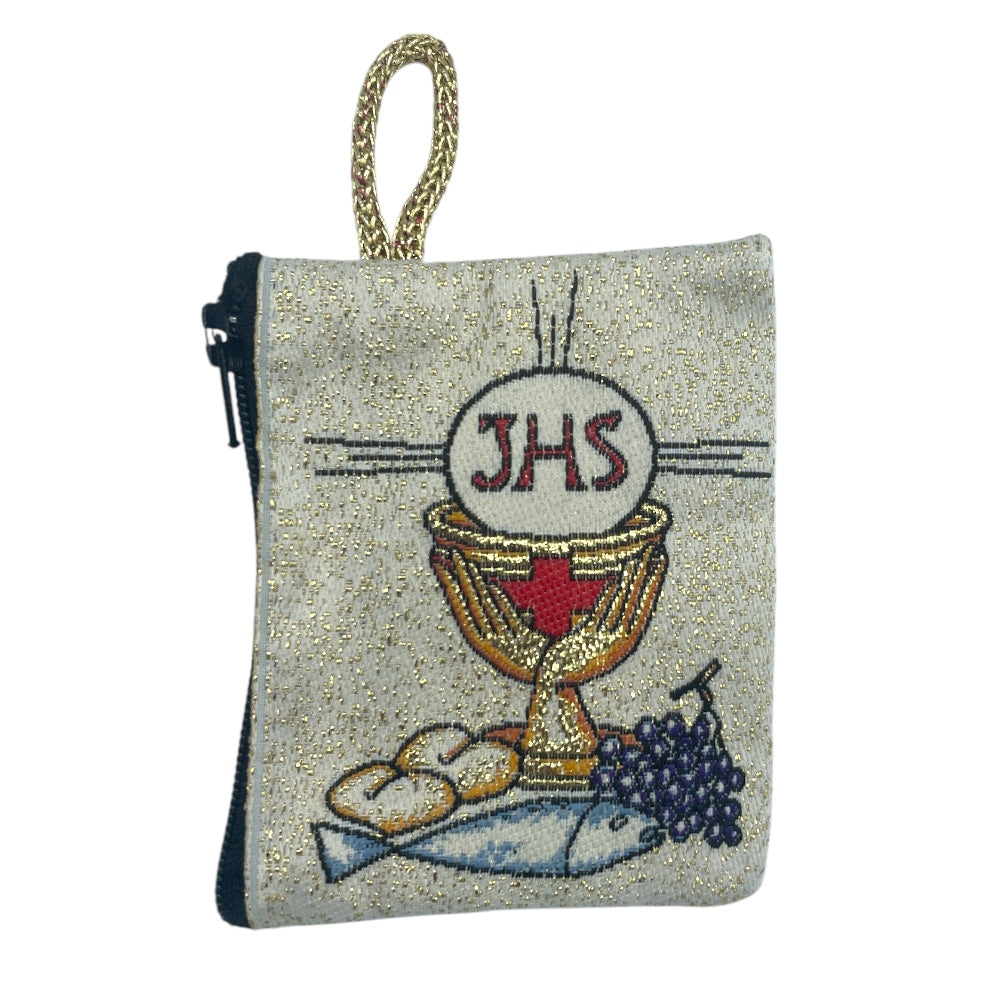🌟 Simbolismo Eucaristico: Ogni elemento di questo rosario richiama il sacramento dell'Eucaristia: l'oro simboleggia la divinità di Cristo, le perle rappresentano la purezza dell'anima, l'astuccio ricamato custodisce la preghiera come il tabernacolo custodisce l'Eucaristia.