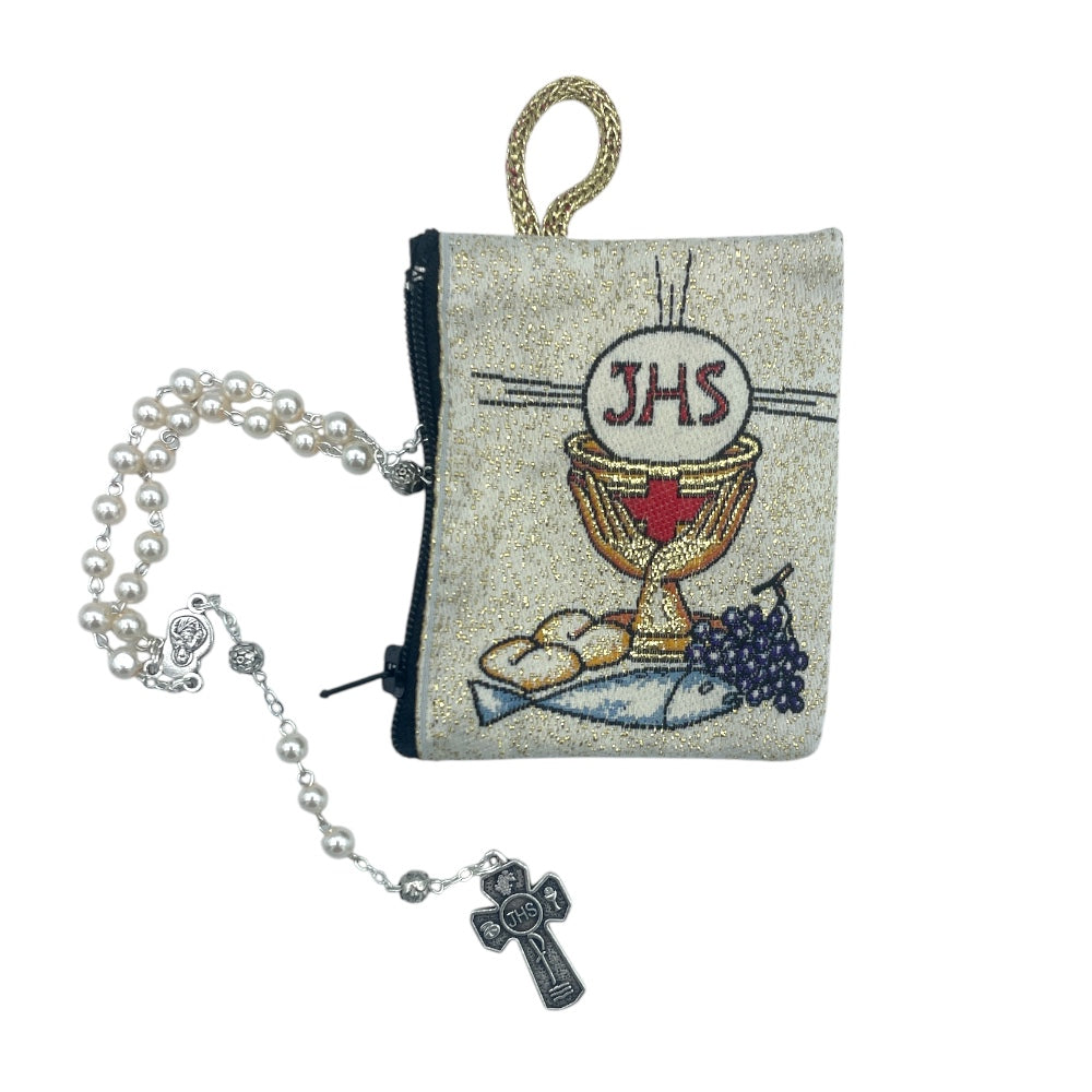 Rosario Prima Comunione con Astuccio Ricamato e Grani Perla Dorati - Bomboniera Sacramentale di Lusso