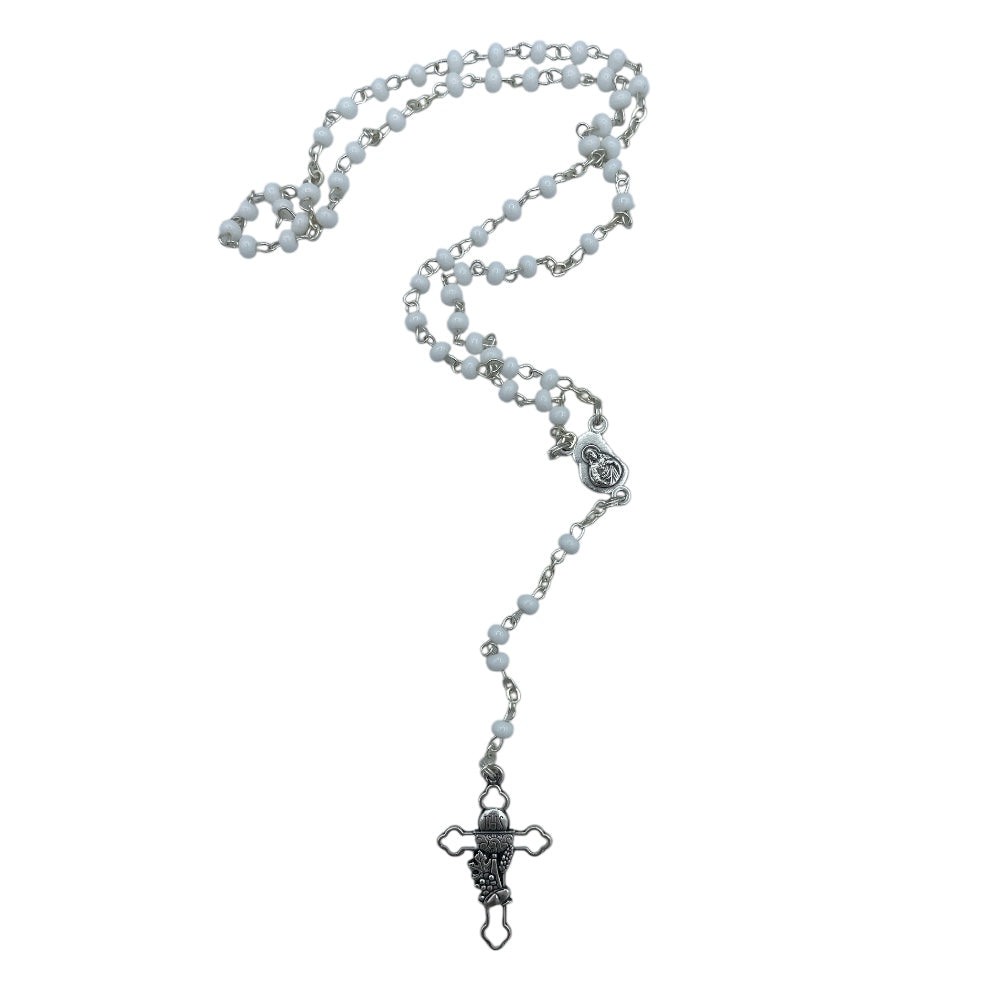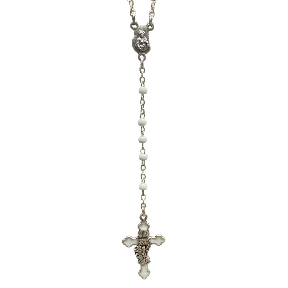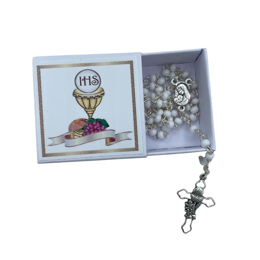 Rosario Prima Comunione con Grani in Vetro Bianco - Simbolo Eucaristico
