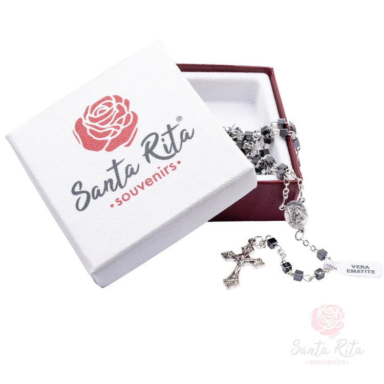 Rosario devozionale moderno con grani cubici in ematite naturale, dedicato a Santa Rita da Cascia per una preghiera contemporanea e spiritualmente intensa.