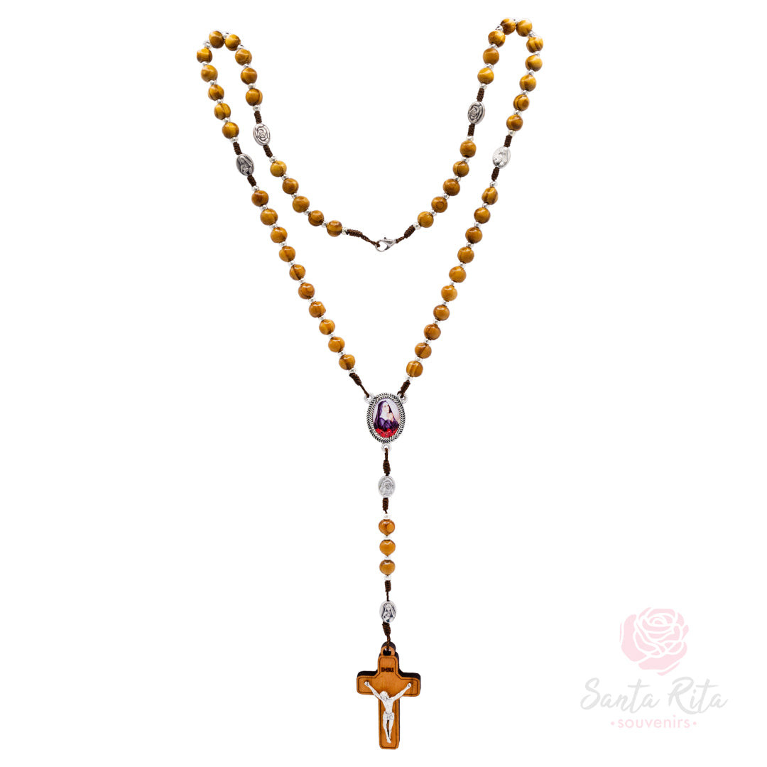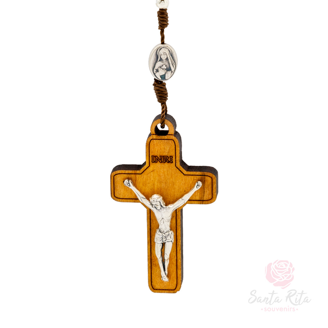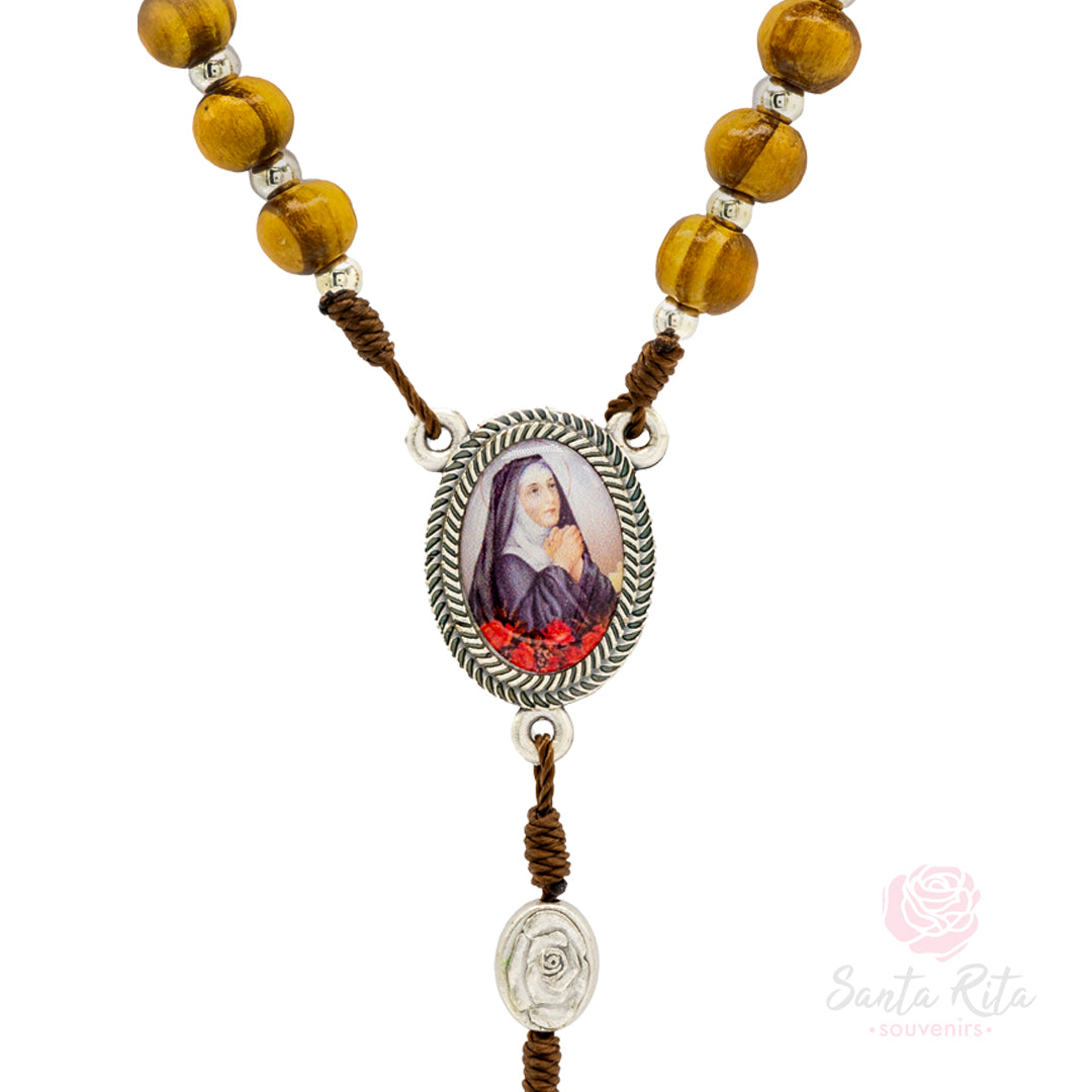 Questo elegante rosario è realizzato interamente con vero legno d'ulivo proveniente dalle colline umbre, terra di spiritualità e tradizione religiosa. Ogni grano è tornito a mano e levigato con cura, offrendo una sensazione piacevole e naturale al tatto durante la preghiera. La corda cerata nera garantisce resistenza e durata nel tempo, mentre la medaglietta centrale raffigura Santa Rita in preghiera.