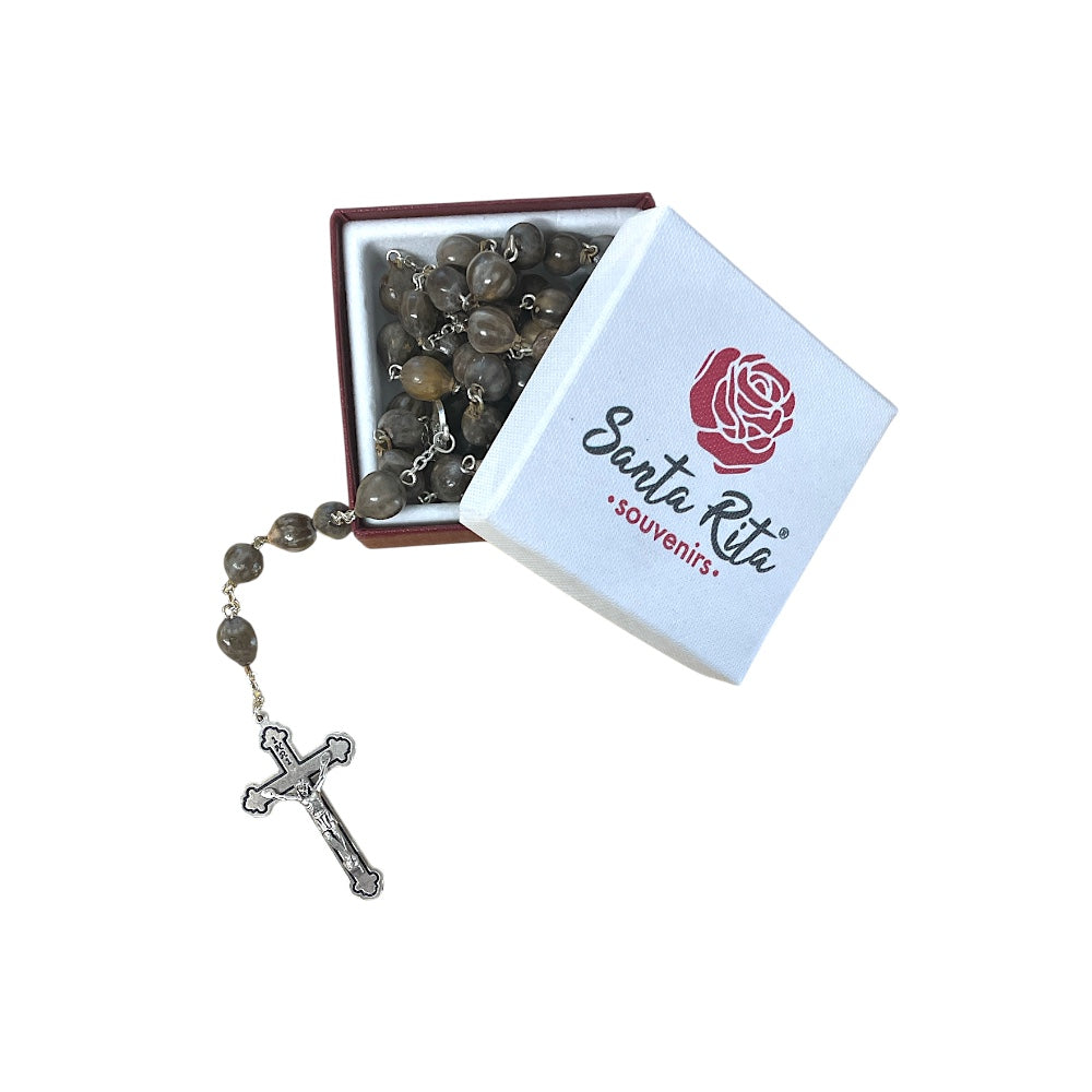 La medaglietta centrale raffigura Santa Rita in preghiera, mentre il crocifisso completa questo rosario dal forte valore simbolico. I semi naturali, con le loro sfumature e texture uniche, rendono ogni rosario un pezzo irripetibile, espressione autentica della spiritualità tradizionale.