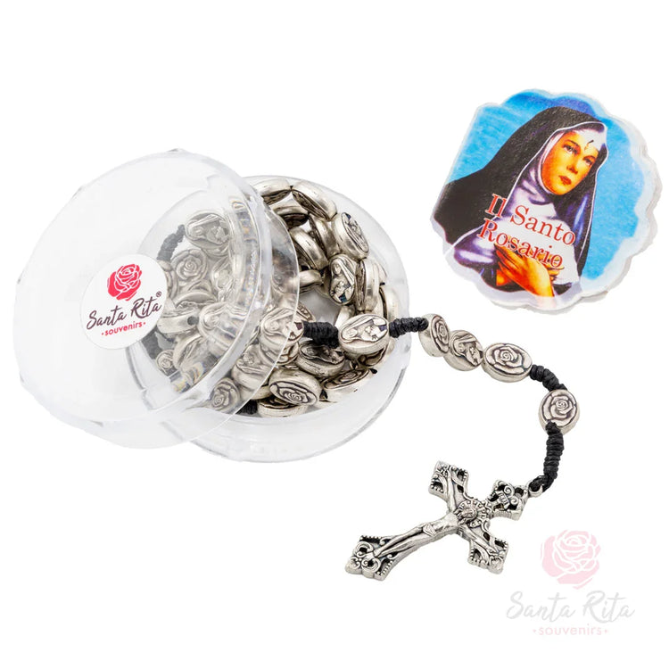 Questo elegante rosario è realizzato con corda cerata nera resistente e impreziosito da grani in zama (lega metallica) finemente lavorati che alternano l'effigie di Santa Rita e il simbolo della rosa del miracolo. Il crocifisso cesellato e il medaglione centrale raffigurante Santa Rita in preghiera evocano la forza della fede e l'intercessione della Santa delle cause impossibili.