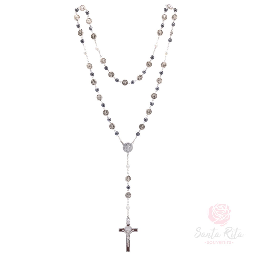 Questo potente rosario è realizzato con grani tondi in ematite naturale, minerale simbolo di forza interiore e protezione spirituale, che alterna piccole perle chiare a medaglie raffiguranti San Benedetto lungo tutta la corona. La sequenza culmina con la croce finale impreziosita dalla medaglia benedettina, rendendo questo rosario un oggetto di fede autentica e protezione spirituale completa.