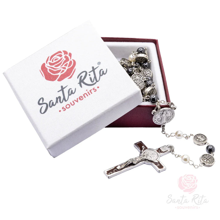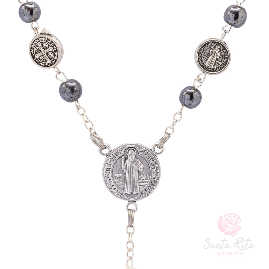 Rosario devozionale dedicato a San Benedetto con grani in ematite naturale e medaglie benedettine, simbolo di protezione spirituale e forza nella fede.