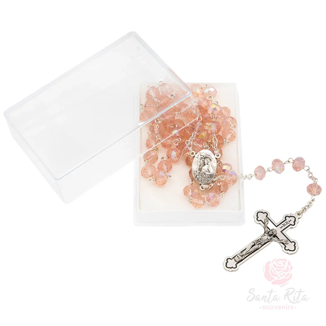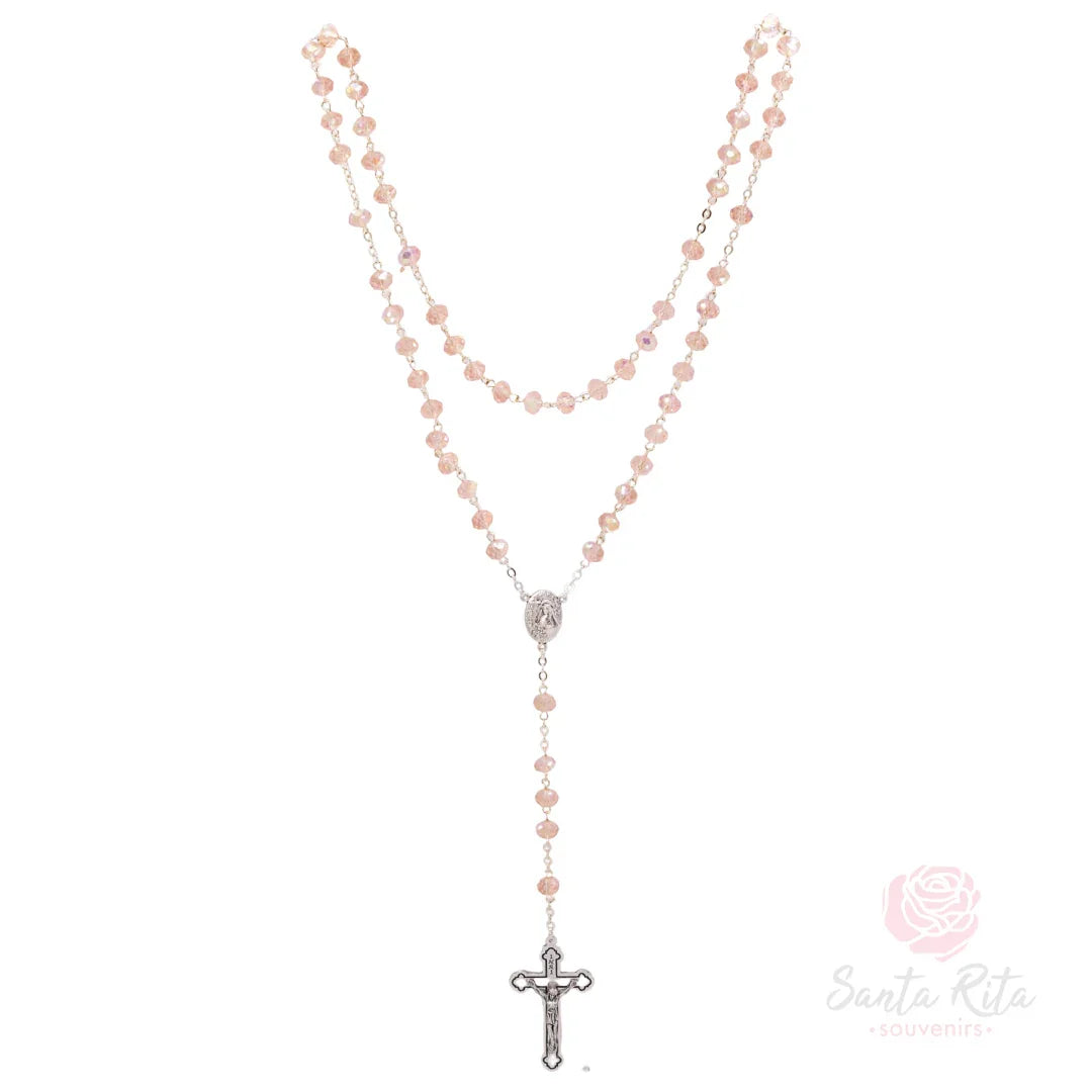 Rosario devozionale classico con grani in mezzo cristallo trasparente, dedicato a Santa Rita da Cascia per la preghiera quotidiana e la devozione spirituale.